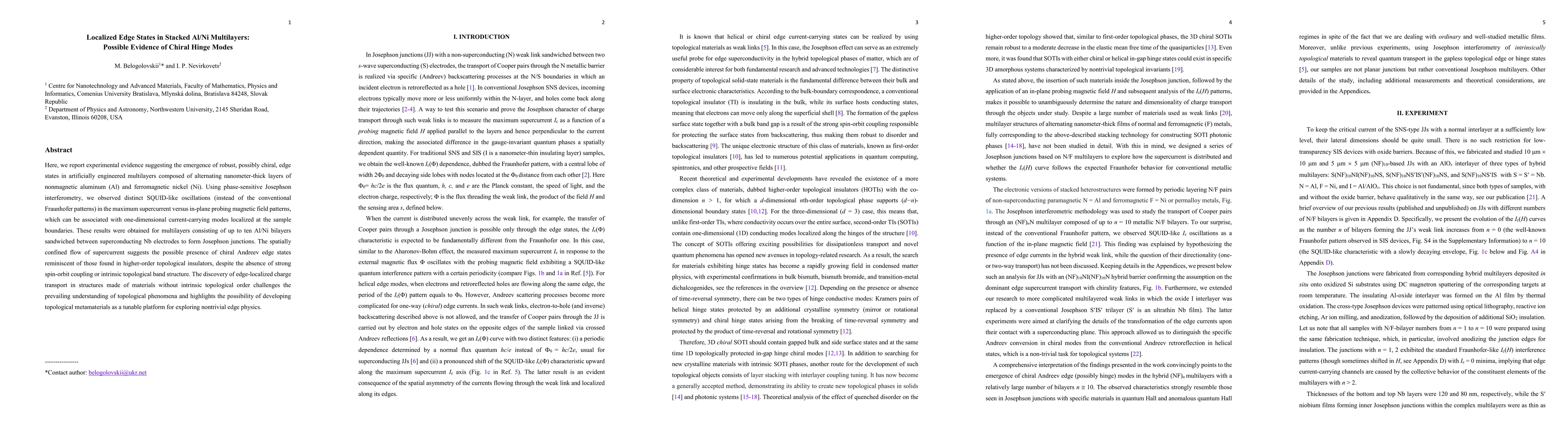 Here, we report experimental evidence suggesting the emergence of robust, possibly chiral, edge states in artificially engineered multilayers composed of alternating nanometer-thick layers of nonmagnetic aluminum (Al) and ferromagnetic nickel (Ni). Using phase-sensitive Josephson interferometry, we observed distinct SQUID-like oscillations (instead of the conventional Fraunhofer patterns) in the maximum supercurrent versus in-plane probing magnetic field patterns, which can be associated with one-dimensional current-carrying modes localized at the sample boundaries. These results were obtained for multilayers consisting of up to ten Al/Ni bilayers sandwiched between superconducting Nb electrodes to form Josephson junctions. The spatially confined flow of supercurrent suggests the possible presence of chiral Andreev edge states reminiscent of those found in higher-order topological insulators, despite the absence of strong spin-orbit coupling or intrinsic topological band structure. The discovery of edge-localized charge transport in structures made of materials without intrinsic topological order challenges the prevailing understanding of topological phenomena and highlights the possibility of developing topological metamaterials as a tunable platform for exploring nontrivial edge physics.