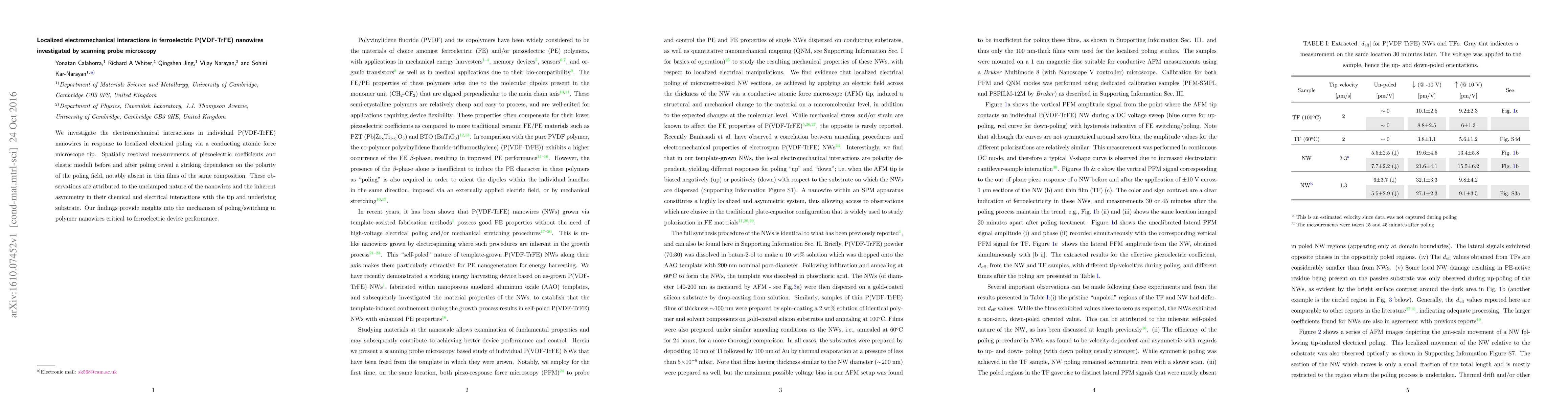 This paper investigates electromechanical interactions in ferroelectric P(VDF-TrFE) nanowires using scanning probe microscopy, revealing distinct piezoelectric and elastic properties influenced by the poling field polarity, due to the unclamped nature and asymmetry of nanowires. These insights are vital for enhancing ferroelectric device performance.