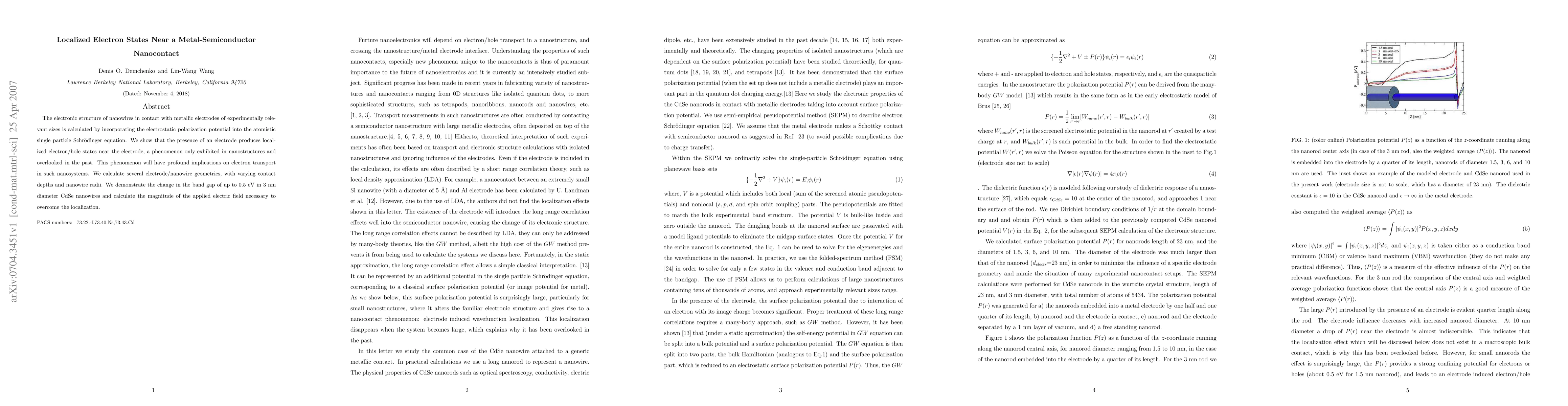 The electronic structure of nanowires in contact with metallic electrodes of experimentally relevant sizes is calculated by incorporating the electrostatic polarization potential into the atomistic single particle Schr\"odinger equation. We show that the presence of an electrode produces localized electron/hole states near the electrode, a phenomenon only exhibited in nanostructures and overlooked in the past. This phenomenon will have profound implications on electron transport in such nanosystems. We calculate several electrode/nanowire geometries, with varying contact depths and nanowire radii. We demonstrate the change in the band gap of up to 0.5 eV in 3 nm diameter CdSe nanowires and calculate the magnitude of the applied electric field necessary to overcome the localization.