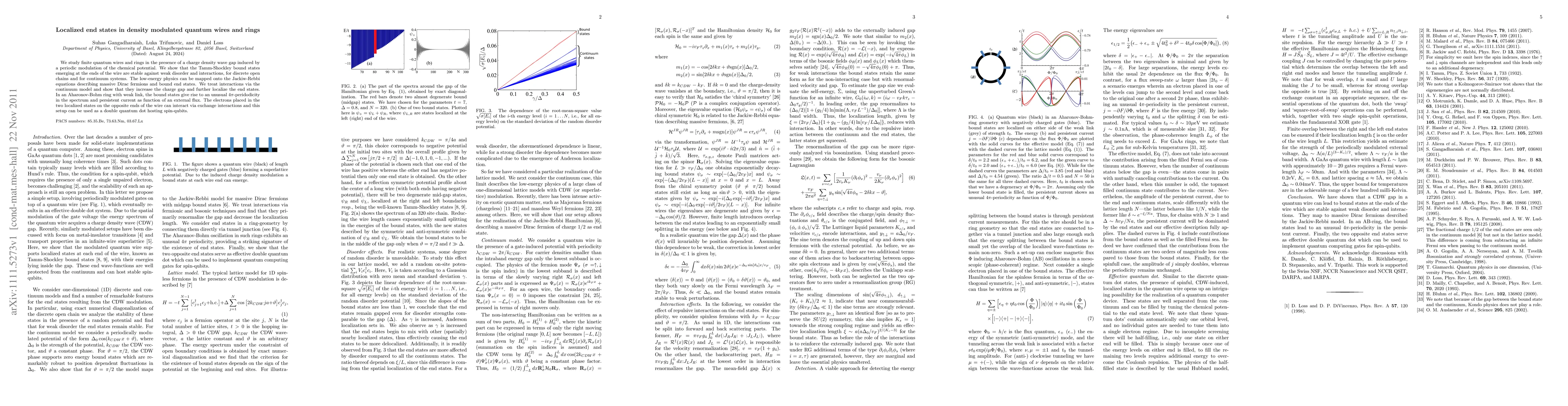 We study finite quantum wires and rings in the presence of a charge density wave gap induced by a periodic modulation of the chemical potential. We show that the Tamm-Shockley bound states emerging at the ends of the wire are stable against weak disorder and interactions, for discrete open chains and for continuum systems. The low-energy physics can be mapped onto the Jackiw-Rebbi equations describing massive Dirac fermions and bound end states. We treat interactions via the continuum model and show that they increase the charge gap and further localize the end states. In an Aharonov-Bohm ring with weak link, the bound states give rise to an unusual $4\pi$-peridodicity in the spectrum and persistent current as function of an external flux. The electrons placed in the two localized states on the opposite ends of the wire can interact via exchange interactions and this setup can be used as a double quantum dot hosting spin-qubits.