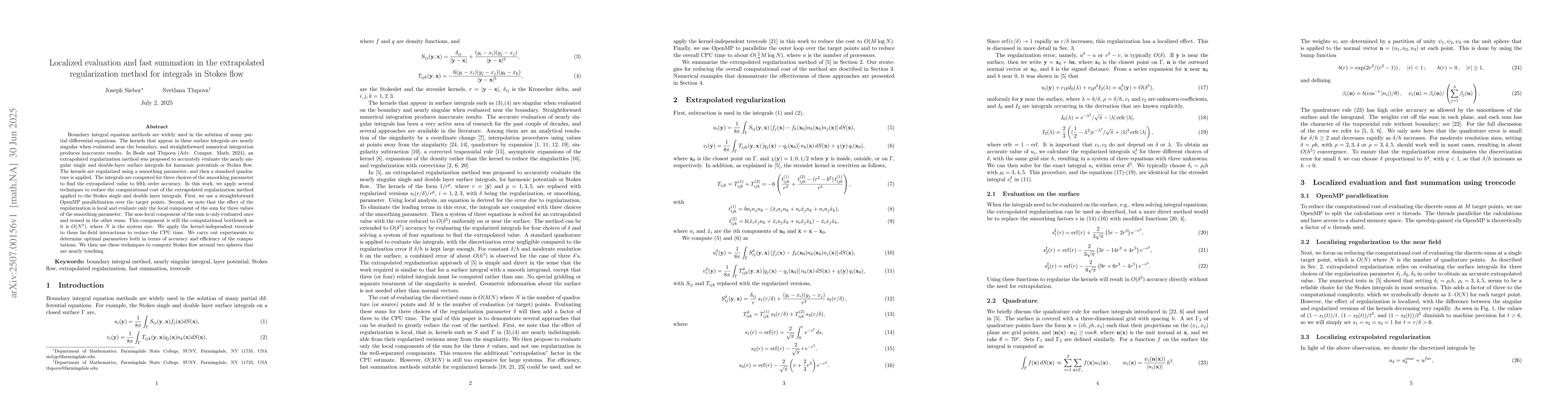 Boundary integral equation methods are widely used in the solution of many partial differential equations. The kernels that appear in these surface integrals are nearly singular when evaluated near the boundary, and straightforward numerical integration produces inaccurate results. In Beale and Tlupova (Adv. Comput. Math, 2024), an extrapolated regularization method was proposed to accurately evaluate the nearly singular single and double-layer surface integrals for harmonic potentials or Stokes flow. The kernels are regularized using a smoothing parameter, and then a standard quadrature is applied. The integrals are computed for three choices of the smoothing parameter to find the extrapolated value to fifth order accuracy. In this work, we apply several techniques to reduce the computational cost of the extrapolated regularization method applied to the Stokes single and double layer integrals. First, we use a straightforward OpenMP parallelization over the target points. Second, we note that the effect of the regularization is local and evaluate only the local component of the sum for three values of the smoothing parameter. The non-local component of the sum is only evaluated once and reused in the other sums. This component is still the computational bottleneck as it is $O(N^2)$, where $N$ is the system size. We apply the kernel-independent treecode to these far-field interactions to reduce the CPU time. We carry out experiments to determine optimal parameters both in terms of accuracy and efficiency of the computations. We then use these techniques to compute Stokes flow around two spheres that are nearly touching.