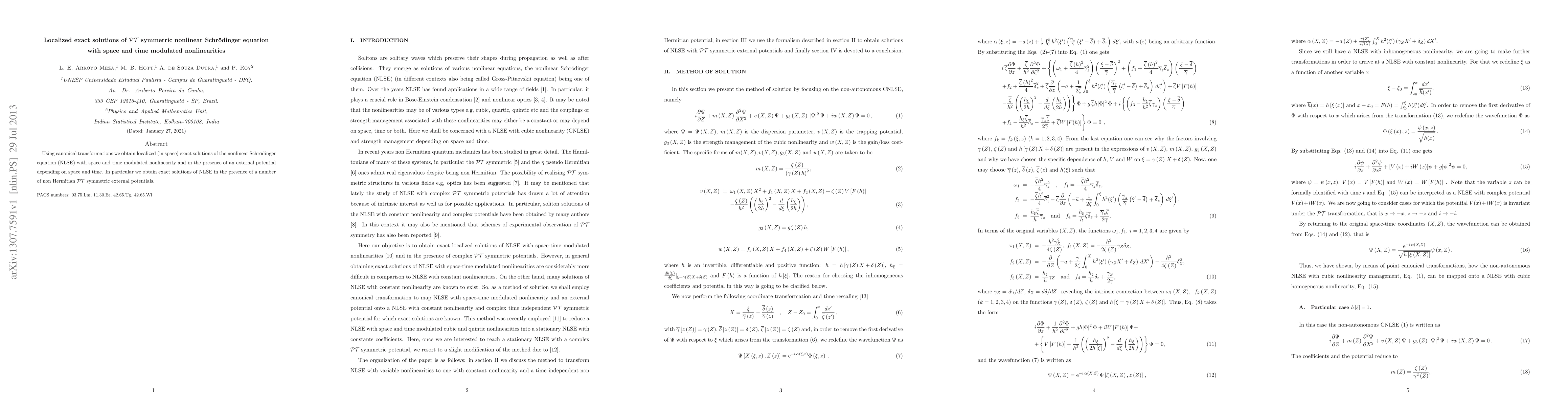 Using canonical transformations we obtain localized (in space) exact solutions of the nonlinear Schr\"odinger equation (NLSE) with space and time modulated nonlinearity and in the presence of an external potential depending on space and time. In particular we obtain exact solutions of NLSE in the presence of a number of non Hermitian $\mathcal{PT}$ symmetric external potentials.