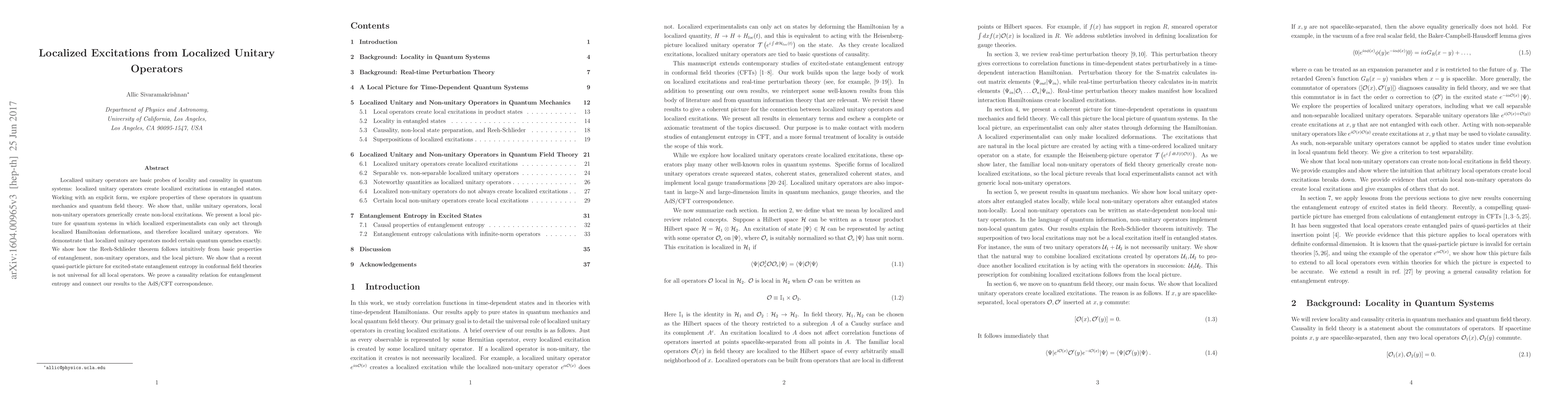 This paper explores the properties of localized unitary operators in quantum mechanics and field theory, demonstrating that they create localized excitations in entangled states. It contrasts these with local non-unitary operators, which typically generate non-local excitations, and connects these findings to the Reeh-Schlieder theorem, entanglement entropy, and the AdS/CFT correspondence.