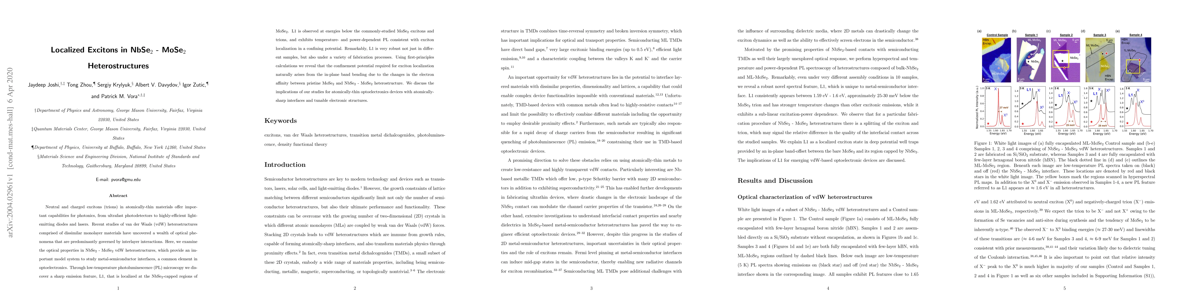 This study investigates localized excitons in NbSe$_2$-MoSe$_2$ van der Waals heterostructures, discovering a sharp emission feature (L1) localized at NbSe$_2$-capped regions of MoSe$_2$ due to in-plane band bending from differing electron affinities. This finding has significant implications for optoelectronic devices with sharp interfaces and tunable electronic properties.