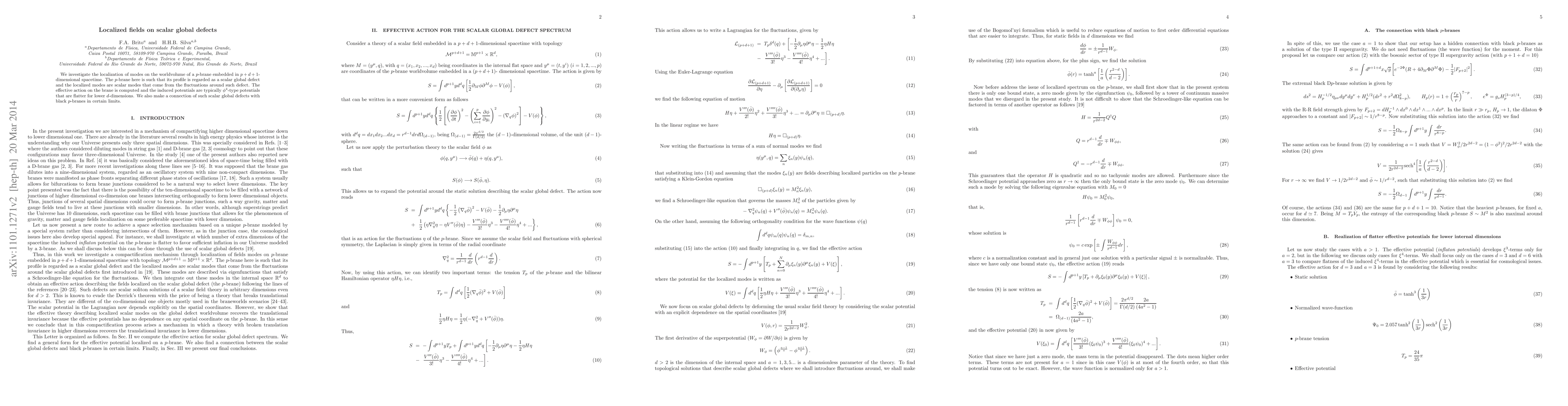 We investigate the localization of modes on the worldvolume of a p-brane embedded in p+d+1-dimensional spacetime. The p-brane here is such that its profile is regarded as a scalar global defect and the localized modes are scalar modes that come from the fluctuations around such defect. The effective action on the brane is computed and the induced potentials are typically phi^4-type potentials that are flatter for lower d-dimensions. We also make a connection of such scalar global defects with black p-branes in certain limits.