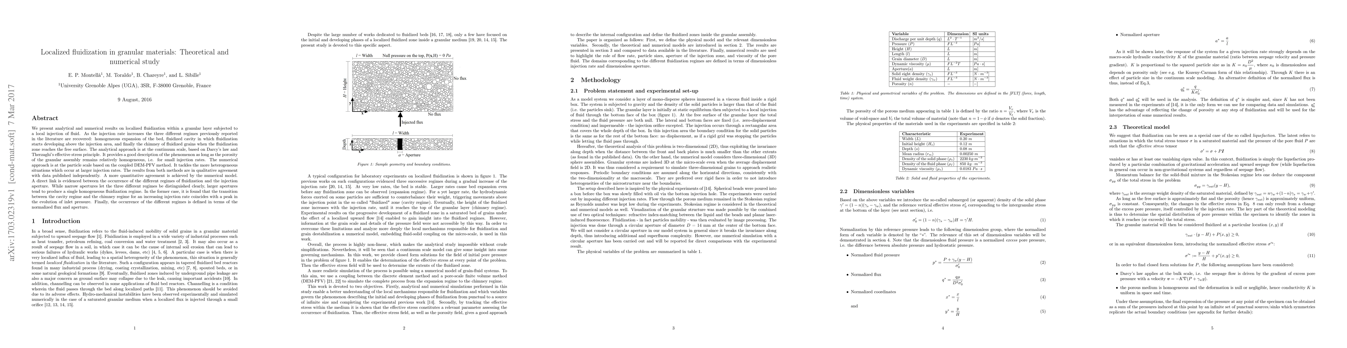 This paper investigates localized fluidization in granular materials through both analytical and numerical methods, identifying three distinct fluidization regimes: homogeneous expansion, fluidized cavity, and chimney formation. The analytical approach, based on Darcy's law, works well for small injection rates, while the numerical DEM-PFV method handles more heterogeneous conditions at larger rates, achieving better quantitative agreement.