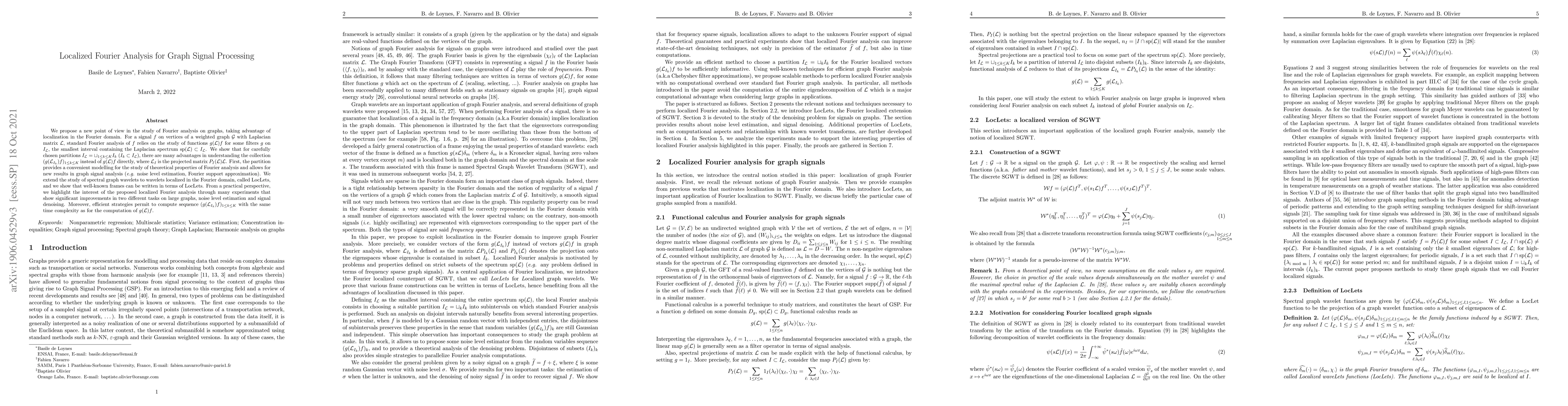 This paper introduces localized Fourier analysis for graph signal processing, proposing a method that partitions the Laplacian spectrum to study localized spectral graph wavelets called LocLets. This approach offers theoretical benefits and practical improvements in noise level estimation and signal denoising on large graphs.