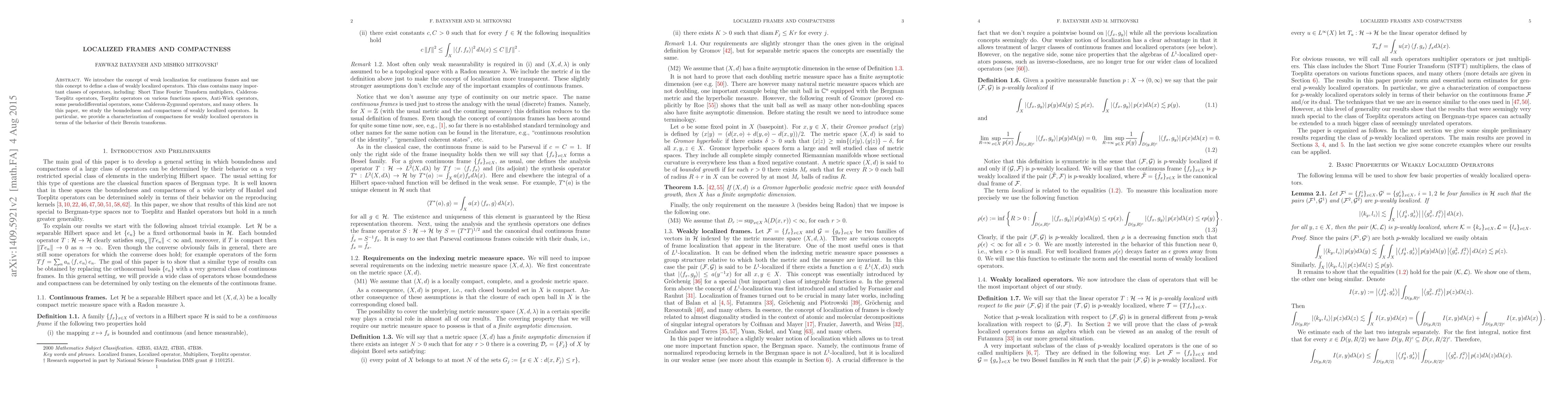 We introduce the concept of weak-localization for generalized frames and use this concept to define a class of weakly localized operators. This class contains many important operators, including: Short Time Fourier Transform multipliers, Calderon-Toeplitz operators, Toeplitz operators on various functions spaces, Anti-Wick operators, and many others. In this paper, we study the boundedness and compactness of weakly localized operators. In particular, we provide a characterization of compactness for weakly localized operators in terms of the behavior of their Berezin transform.