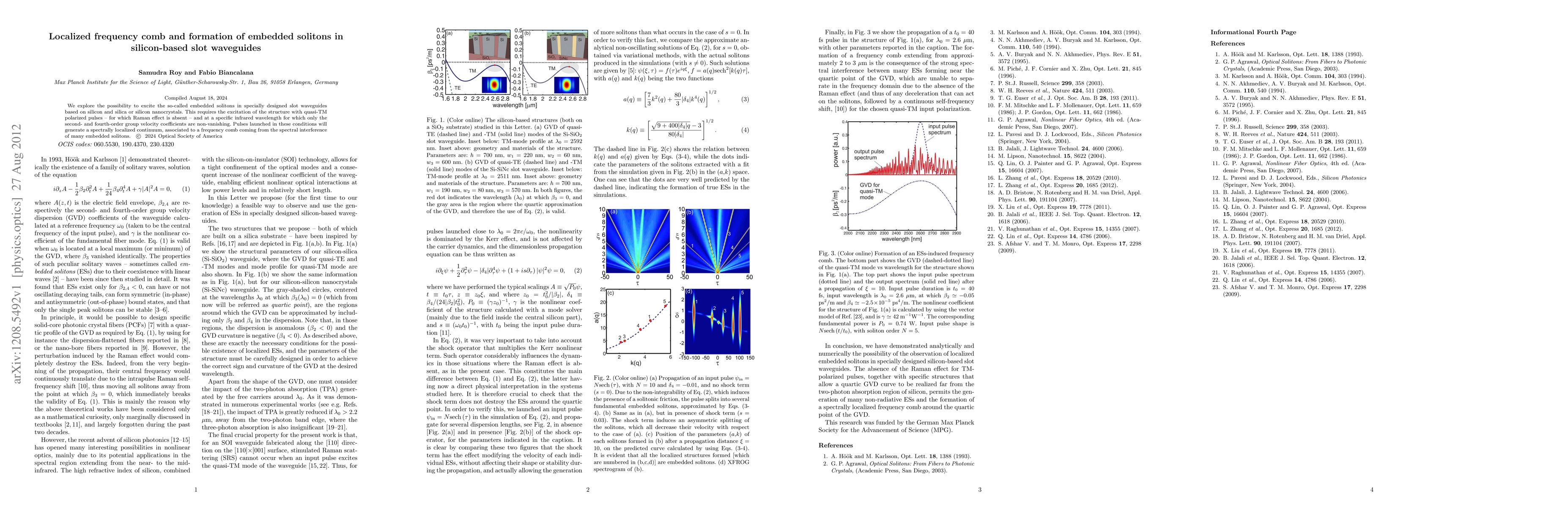 This research investigates the formation of embedded solitons in silicon-based slot waveguides using quasi-TM polarized pulses at a specific infrared wavelength, generating a localized frequency comb through spectral interference of multiple solitons. The absence of Raman effect and specific group velocity coefficients are crucial for this phenomenon.