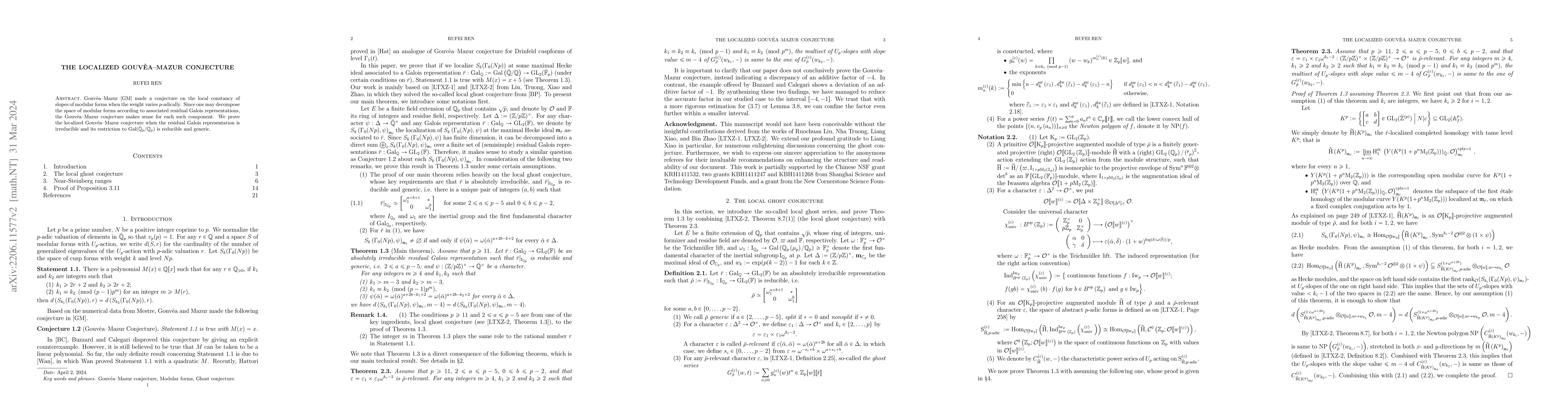 The paper proves the localized version of the Gouv\^ea-Mazur conjecture for irreducible residual Galois representations whose restrictions to $\textrm{Gal}(\overline{\mathbb{Q}}_p/\mathbb{Q}_p)$ are reducible and very generic. This addresses the local constancy of slopes of modular forms varying $p$-adically.