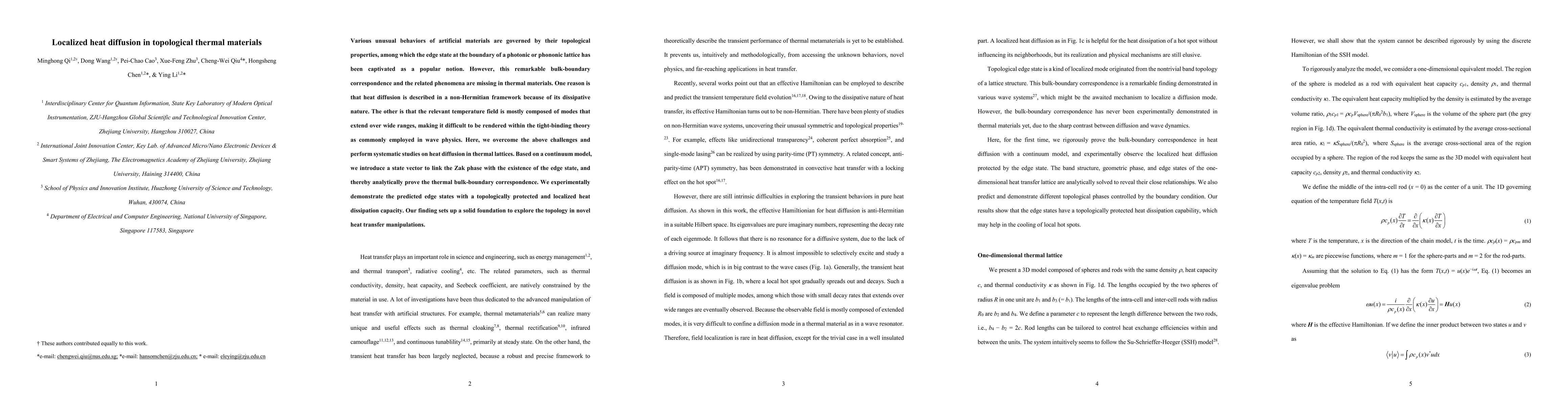 Various unusual behaviors of artificial materials are governed by their topological properties, among which the edge state at the boundary of a photonic or phononic lattice has been captivated as a popular notion. However, this remarkable bulk-boundary correspondence and the related phenomena are missing in thermal materials. One reason is that heat diffusion is described in a non-Hermitian framework because of its dissipative nature. The other is that the relevant temperature field is mostly composed of modes that extend over wide ranges, making it difficult to be rendered within the tight-binding theory as commonly employed in wave physics. Here, we overcome the above challenges and perform systematic studies on heat diffusion in thermal lattices. Based on a continuum model, we introduce a state vector to link the Zak phase with the existence of the edge state, and thereby analytically prove the thermal bulk-boundary correspondence. We experimentally demonstrate the predicted edge states with a topologically protected and localized heat dissipation capacity. Our finding sets up a solid foundation to explore the topology in novel heat transfer manipulations.