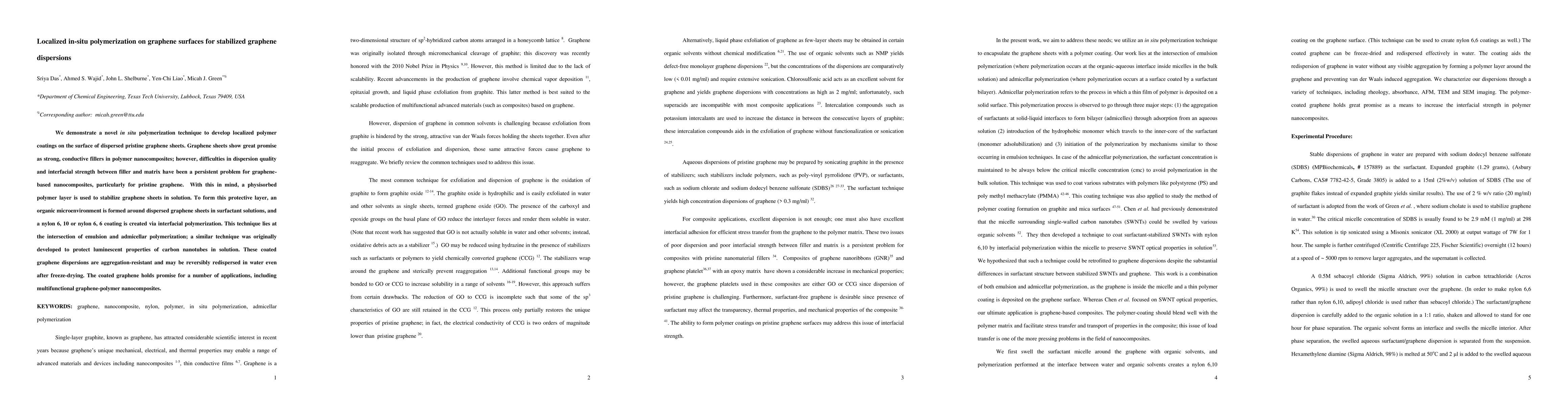 This paper presents an in situ polymerization method to create localized polymer coatings on pristine graphene sheets, enhancing their dispersion stability and interfacial strength in polymer nanocomposites. The technique involves forming an organic microenvironment around graphene in surfactant solutions, followed by interfacial polymerization to create nylon coatings, resulting in aggregation-resistant, redispersable graphene dispersions.