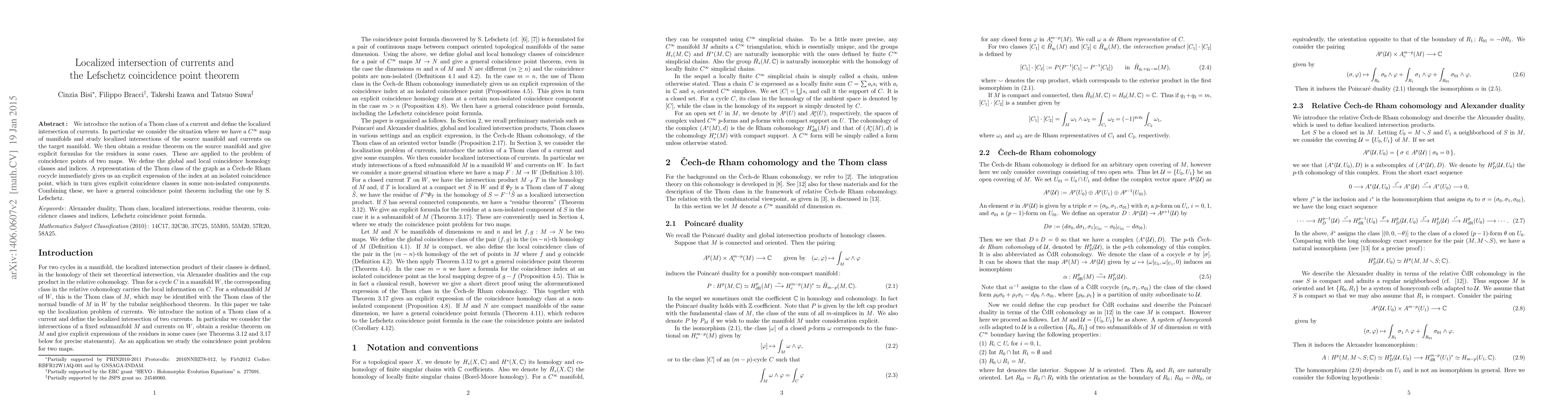 This paper introduces the localized intersection of currents and applies it to study coincidence points of smooth maps between manifolds. It defines Thom classes of currents and provides a residue theorem, leading to explicit formulas for the residues and a general coincidence point theorem extending the Lefschetz theorem.