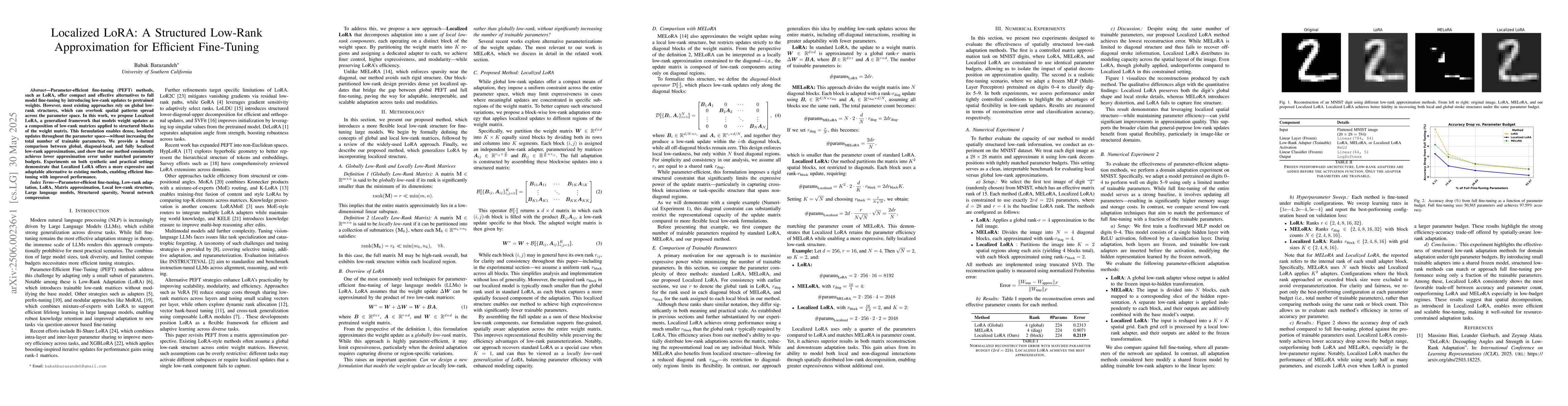 Localized LoRA proposes a new method for efficient fine-tuning that models weight updates as low-rank matrix applications to structured blocks of the weight matrix, achieving lower approximation error than existing methods.