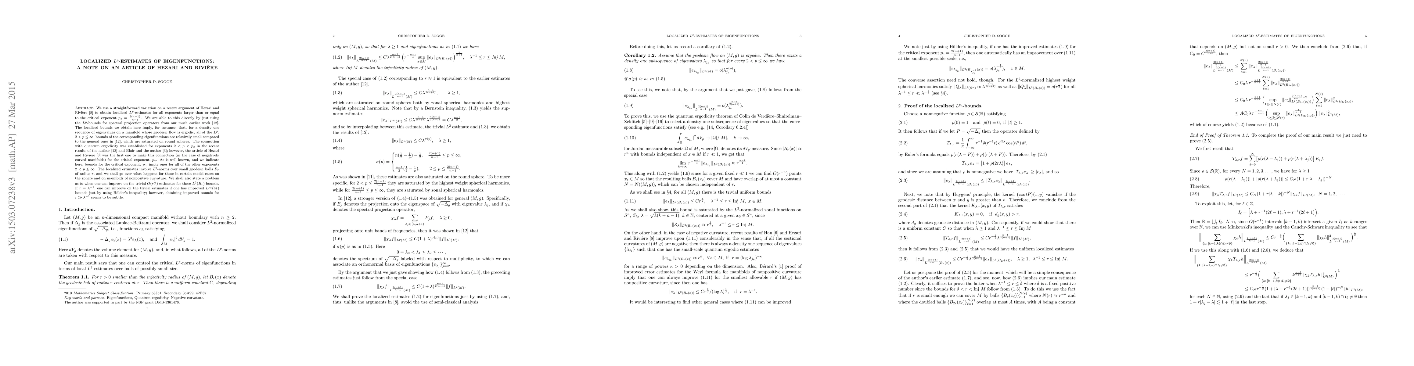 We use a straightforward variation on a recent argument of Hezari and Rivi\`ere~\cite{HR} to obtain localized $L^p$-estimates for all exponents larger than or equal to the critical exponent $p_c=\tfrac{2(n+1)}{n-1}$. We are able to this directly by just using the $L^{p}$-bounds for spectral projection operators from our much earlier work \cite{Seig}. The localized bounds we obtain here imply, for instance, that, for a density one sequence of eigenvalues on a manifold whose geodesic flow is ergodic, all of the $L^p$, $2
