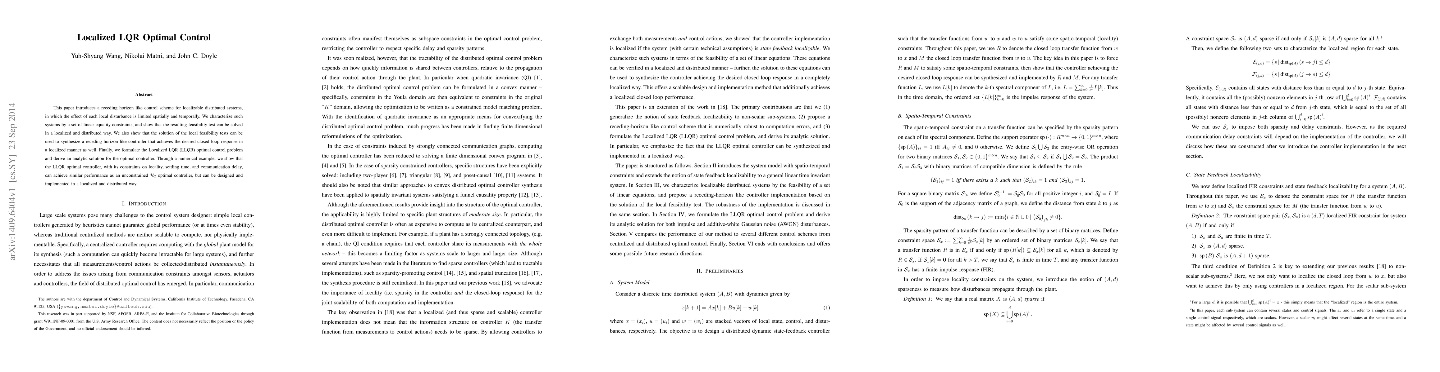 This paper introduces a receding horizon like control scheme for localizable distributed systems, in which the effect of each local disturbance is limited spatially and temporally. We characterize such systems by a set of linear equality constraints, and show that the resulting feasibility test can be solved in a localized and distributed way. We also show that the solution of the local feasibility tests can be used to synthesize a receding horizon like controller that achieves the desired closed loop response in a localized manner as well. Finally, we formulate the Localized LQR (LLQR) optimal control problem and derive an analytic solution for the optimal controller. Through a numerical example, we show that the LLQR optimal controller, with its constraints on locality, settling time, and communication delay, can achieve similar performance as an unconstrained H2 optimal controller, but can be designed and implemented in a localized and distributed way.
