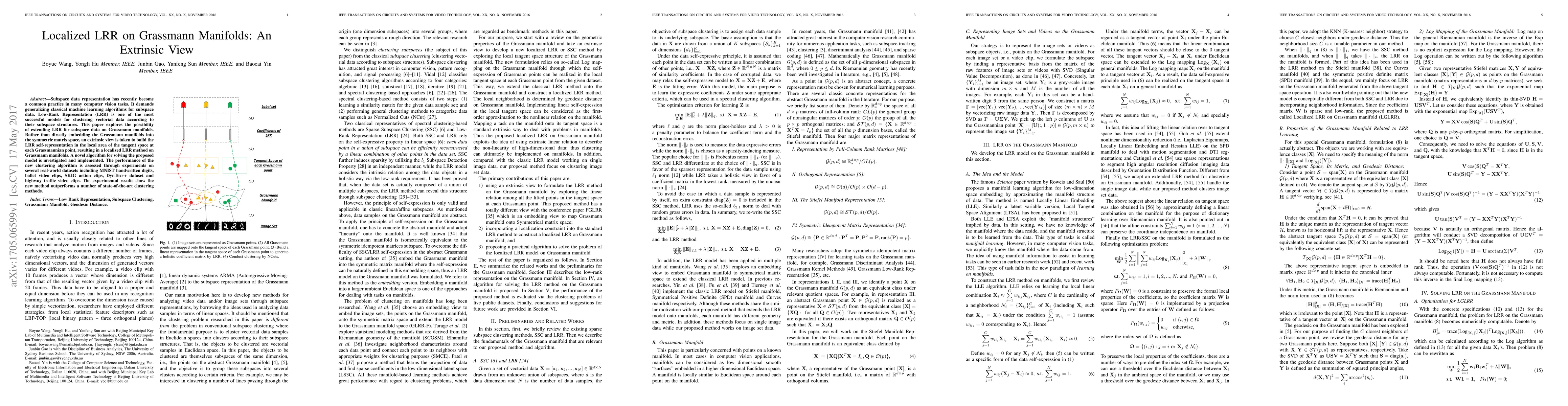 Subspace data representation has recently become a common practice in many computer vision tasks. It demands generalizing classical machine learning algorithms for subspace data. Low-Rank Representation (LRR) is one of the most successful models for clustering vectorial data according to their subspace structures. This paper explores the possibility of extending LRR for subspace data on Grassmann manifolds. Rather than directly embedding the Grassmann manifolds into the symmetric matrix space, an extrinsic view is taken to build the LRR self-representation in the local area of the tangent space at each Grassmannian point, resulting in a localized LRR method on Grassmann manifolds. A novel algorithm for solving the proposed model is investigated and implemented. The performance of the new clustering algorithm is assessed through experiments on several real-world datasets including MNIST handwritten digits, ballet video clips, SKIG action clips, DynTex++ dataset and highway traffic video clips. The experimental results show the new method outperforms a number of state-of-the-art clustering methods