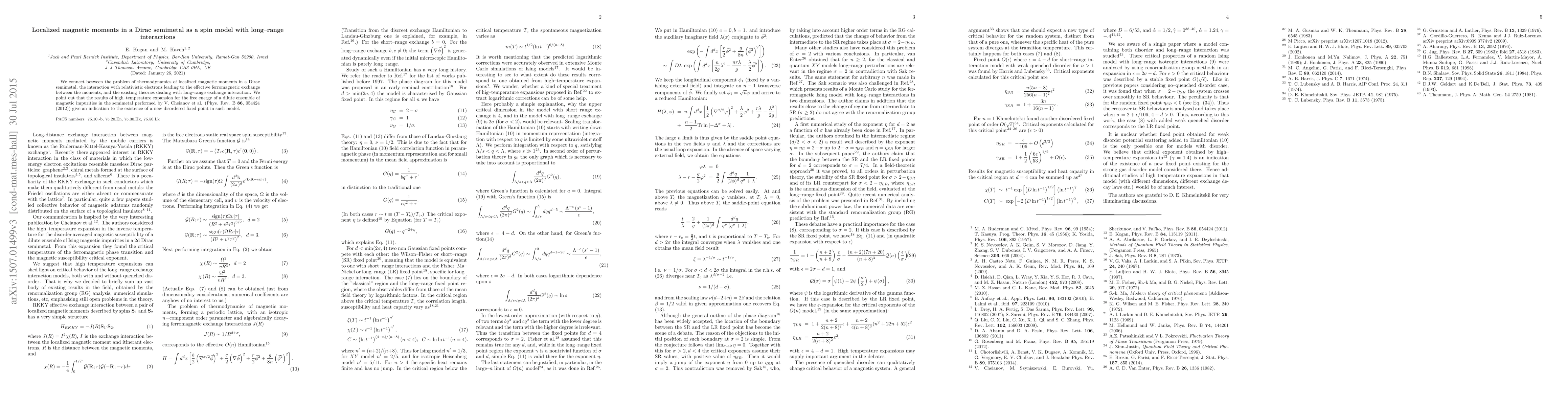 We connect between the problem of thermodynamics of localized magnetic moments in a Dirac semimetal, the interaction with relativistic electrons leading to the effective ferromagnetic exchange between the moments, and the existing theories dealing with long--range exchange interaction. We point out that the results of high--temperature expansion for the free energy of a dilute ensemble of magnetic impurities in the semimetal performed by V. Cheianov et al. (Phys. Rev. B {\bf 86}, 054424 (2012)) give an indication to the existence of a new disordered fixed point in such model.