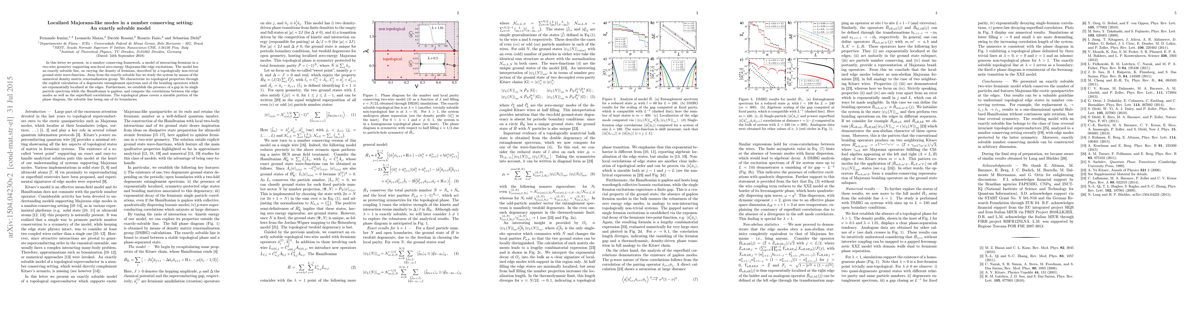 In this letter we present, in a number conserving framework, a model of interacting fermions in a two-wire geometry supporting non-local zero-energy Majorana-like edge excitations. The model has an exactly solvable line, on varying the density of fermions, described by a topologically non-trivial ground state wave-function. Away from the exactly solvable line we study the system by means of the numerical density matrix renormalization group. We characterize its topological properties through the explicit calculation of a degenerate entanglement spectrum and of the braiding operators which are exponentially localized at the edges. Furthermore, we establish the presence of a gap in its single particle spectrum while the Hamiltonian is gapless, and compute the correlations between the edge modes as well as the superfluid correlations. The topological phase covers a sizeable portion of the phase diagram, the solvable line being one of its boundaries.