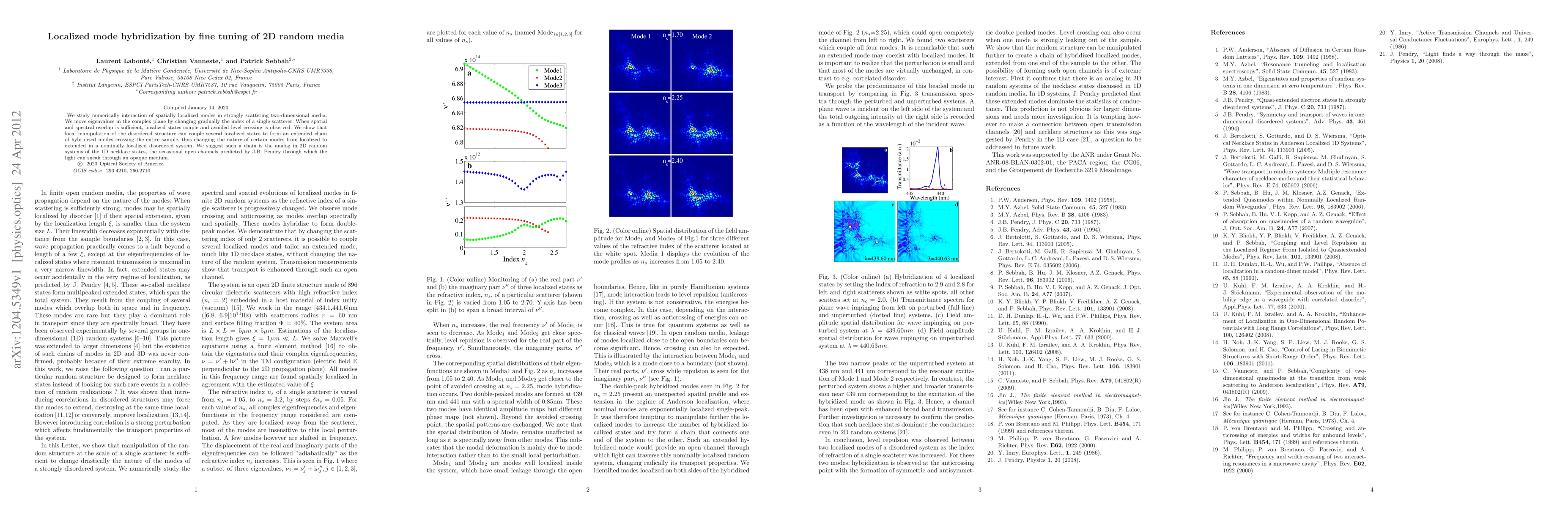 This paper explores the numerical interaction of localized modes in strongly scattering 2D random media, revealing that fine tuning a single scatterer can lead to mode hybridization. By coupling localized states through spectral and spatial overlap, the study demonstrates the formation of an extended chain of hybridized modes, analogous to the 1D necklace states, transforming localized modes into extended ones.