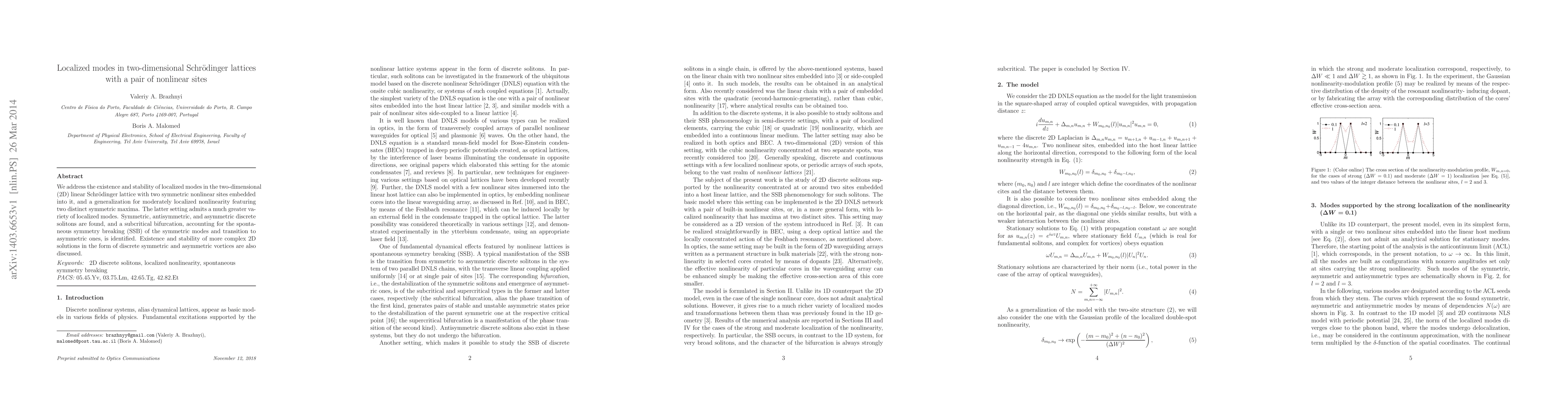 Researchers found localized modes in a 2D linear Schroedinger lattice with nonlinear sites, including discrete solitons and vortices, which exhibit spontaneous symmetry breaking and stability.