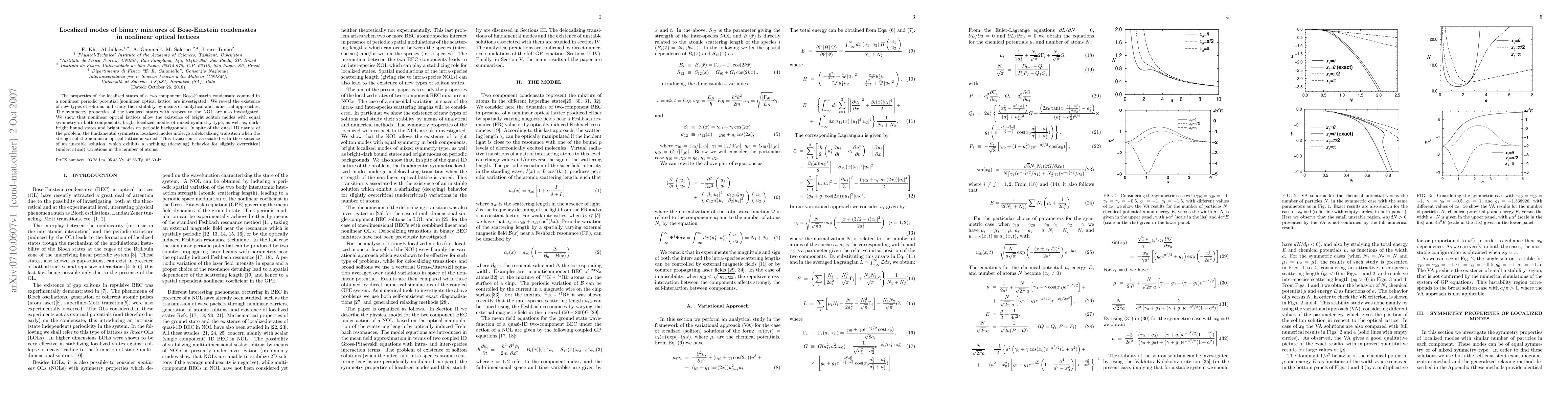 This paper investigates the localized states of a binary Bose-Einstein condensate in a nonlinear optical lattice, revealing new soliton types and their stability. It finds bright solitons, mixed symmetry localized modes, and dark-bright bound states, with fundamental symmetric modes undergoing a delocalizing transition linked to unstable solutions.