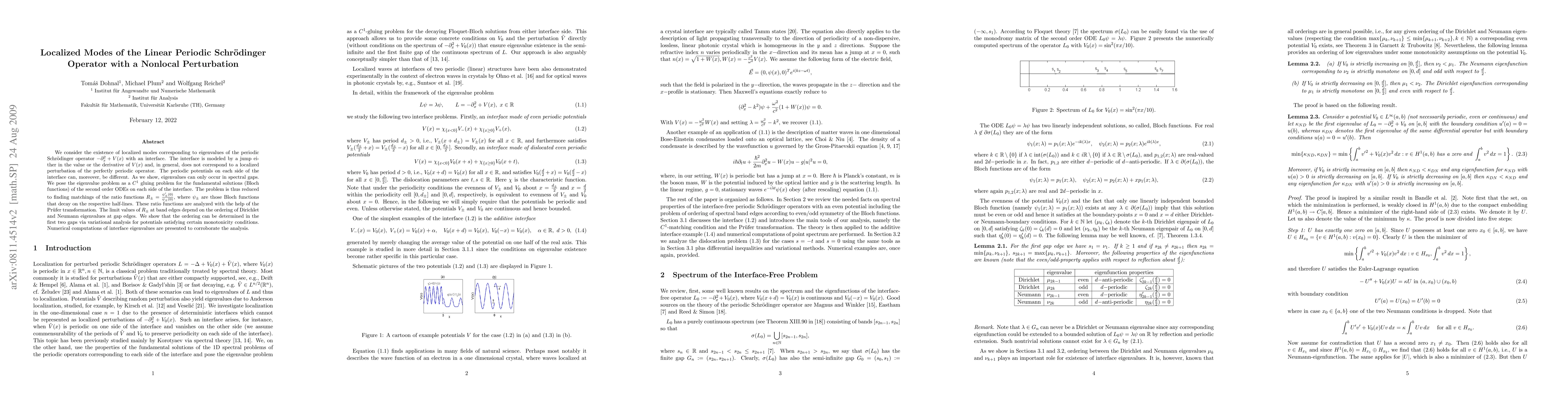 We consider the existence of localized modes corresponding to eigenvalues of the periodic Schr\"{o}dinger operator $-\partial_x^2+ V(x)$ with an interface. The interface is modeled by a jump either in the value or the derivative of $V(x)$ and, in general, does not correspond to a localized perturbation of the perfectly periodic operator. The periodic potentials on each side of the interface can, moreover, be different. As we show, eigenvalues can only occur in spectral gaps. We pose the eigenvalue problem as a $C^1$ gluing problem for the fundamental solutions (Bloch functions) of the second order ODEs on each side of the interface. The problem is thus reduced to finding matchings of the ratio functions $R_\pm=\frac{\psi_\pm'(0)}{\psi_\pm(0)}$, where $\psi_\pm$ are those Bloch functions that decay on the respective half-lines. These ratio functions are analyzed with the help of the Pr\"{u}fer transformation. The limit values of $R_\pm$ at band edges depend on the ordering of Dirichlet and Neumann eigenvalues at gap edges. We show that the ordering can be determined in the first two gaps via variational analysis for potentials satisfying certain monotonicity conditions. Numerical computations of interface eigenvalues are presented to corroborate the analysis.
