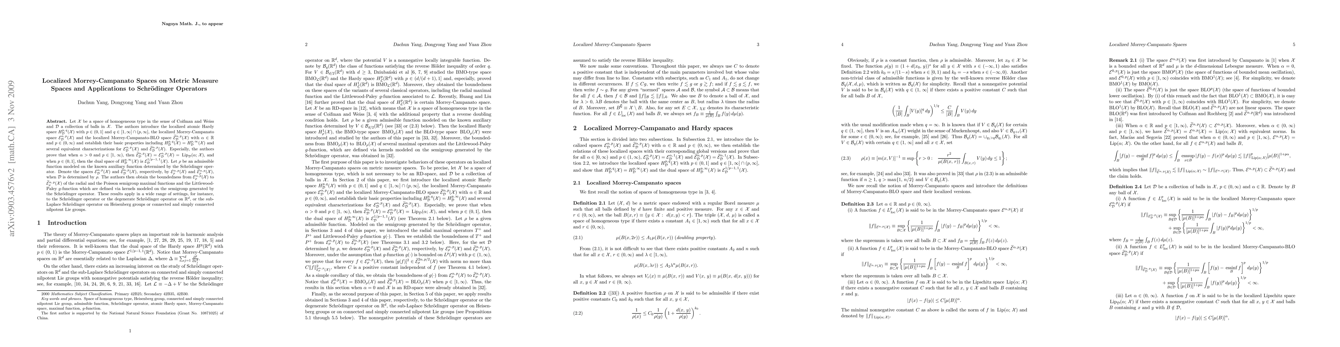 Let ${\mathcal X}$ be a space of homogeneous type in the sense of Coifman and Weiss and ${\mathcal D}$ a collection of balls in $\cx$. The authors introduce the localized atomic Hardy space $H^{p, q}_{\mathcal D}({\mathcal X})$ with $p\in (0,1]$ and $q\in[1,\infty]\cap(p,\infty]$, the localized Morrey-Campanato space ${\mathcal E}^{\alpha, p}_{\mathcal D}({\mathcal X})$ and the localized Morrey-Campanato-BLO space $\widetilde{\mathcal E}^{\alpha, p}_{\mathcal D}({\mathcal X})$ with $\az\in{\mathbb R}$ and $p\in(0, \infty)$ and establish their basic properties including $H^{p, q}_{\mathcal D}({\mathcal X})=H^{p, \infty}_{\mathcal D}({\mathcal X})$ and several equivalent characterizations for ${\mathcal E}^{\alpha, p}_{\mathcal D}({\mathcal X})$ and $\wz{\mathcal E}^{\alpha, p}_{\mathcal D}({\mathcal X})$. Especially, the authors prove that when $p\in(0,1]$, the dual space of $H^{p, \infty}_{\mathcal D}({\mathcal X})$ is ${\mathcal E}^{1/p-1, 1}_{\mathcal D}({\mathcal X})$. Let $\rho$ be an admissible function modeled on the known auxiliary function determined by the Schr\"odinger operator. Denote the spaces ${\mathcal E}^{\alpha, p}_{\mathcal D}({\mathcal X})$ and $\widetilde{\mathcal E}^{\alpha, p}_{\mathcal D}({\mathcal X})$, respectively, by ${\mathcal E}^{\alpha, p}_{\rho}({\mathcal X})$ and $\widetilde{\mathcal E}^{\alpha, p}_{\rho}({\mathcal X})$, when ${\mathcal D}$ is determined by $\rho$. The authors then obtain the boundedness from ${\mathcal E}^{\alpha, p}_{\rho}({\mathcal X})$ to $\widetilde{\mathcal E}^{\alpha, p}_{\rho}({\mathcal X})$ of the radial and the Poisson semigroup maximal functions and the Littlewood-Paley $g$-function which are defined via kernels modeled on the semigroup generated by the Schr\"odinger operator.