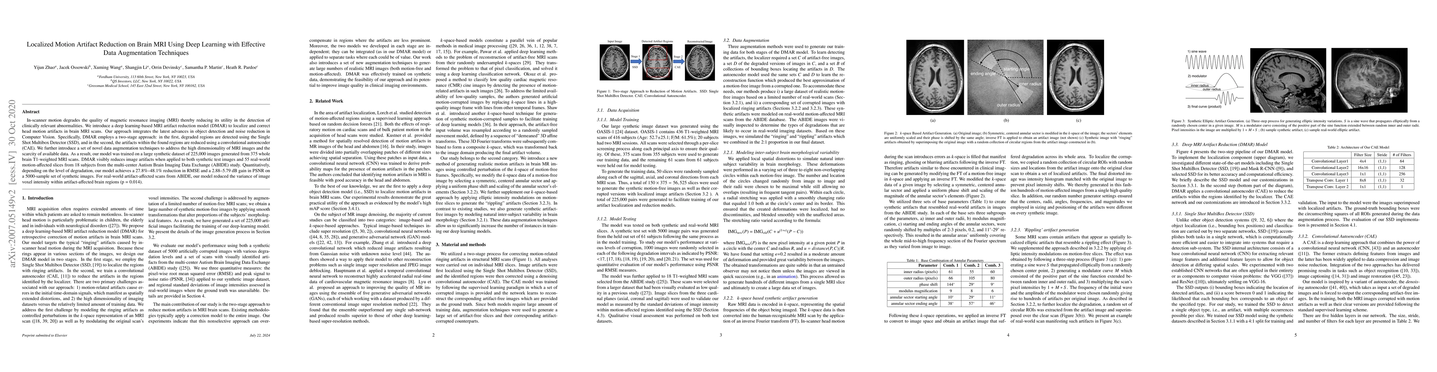 This paper introduces a deep learning model, DMAR, for localizing and reducing motion artifacts in brain MRI scans using a two-stage approach with object detection and convolutional autoencoders. Novel data augmentation techniques were employed to train the model on a large synthetic dataset, achieving significant reductions in RMSE and gains in PSNR on synthetic and real-world test images.