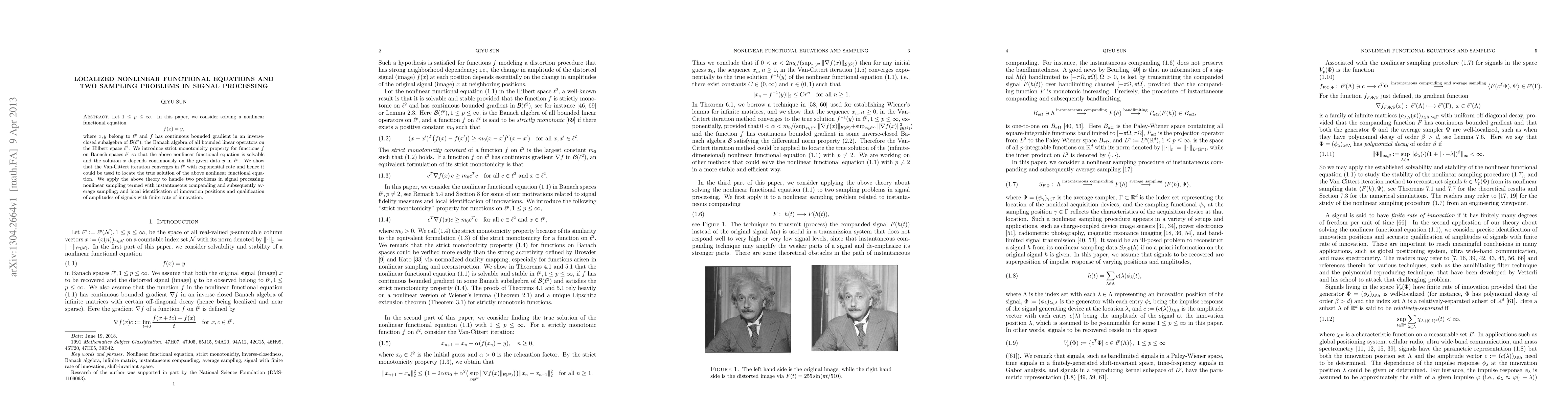 Let $1\le p\le \infty$. In this paper, we consider solving a nonlinear functional equation $$f(x)=y,$$ where $x, y$ belong to $\ell^p$ and $f$ has continuous bounded gradient in an inverse-closed subalgebra of ${\mathcal B}(\ell^2)$, the Banach algebra of all bounded linear operators on the Hilbert space $\ell^2$. We introduce strict monotonicity property for functions $f$ on Banach spaces $\ell^p$ so that the above nonlinear functional equation is solvable and the solution $x$ depends continuously on the given data $y$ in $\ell^p$. We show that the Van-Cittert iteration converges in $\ell^p$ with exponential rate and hence it could be used to locate the true solution of the above nonlinear functional equation. We apply the above theory to handle two problems in signal processing: nonlinear sampling termed with instantaneous companding and subsequently average sampling; and local identification of innovation positions and qualification of amplitudes of signals with finite rate of innovation.