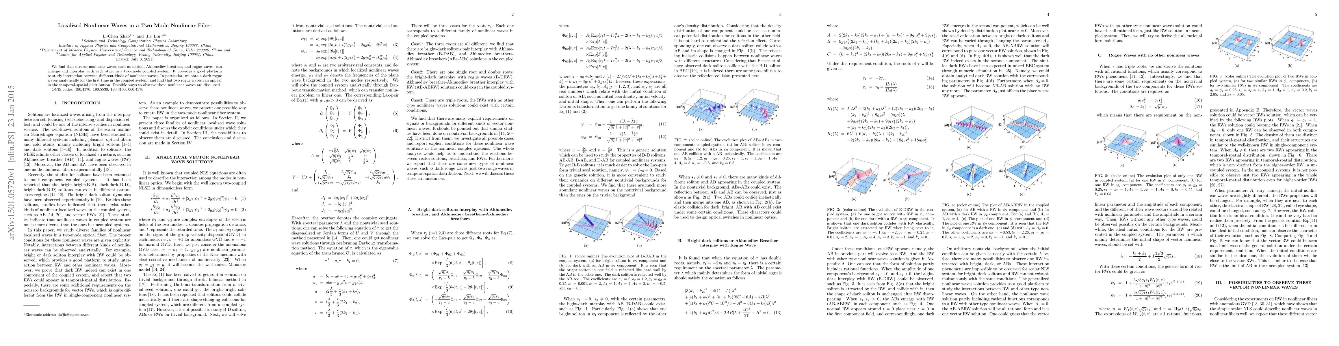We find that diverse nonlinear waves, such as soliton, Akhmediev breather, and rogue waves (RWs), can emerge and interplay with each other in a two-mode coupled system. It provides a good platform to study interaction between different kinds of nonlinear waves. In particular, we obtain dark RWs analytically for the first time in the coupled system, and find that two RWs can appear in the temporal-spatial distribution. Possible ways to observe these nonlinear waves are discussed.