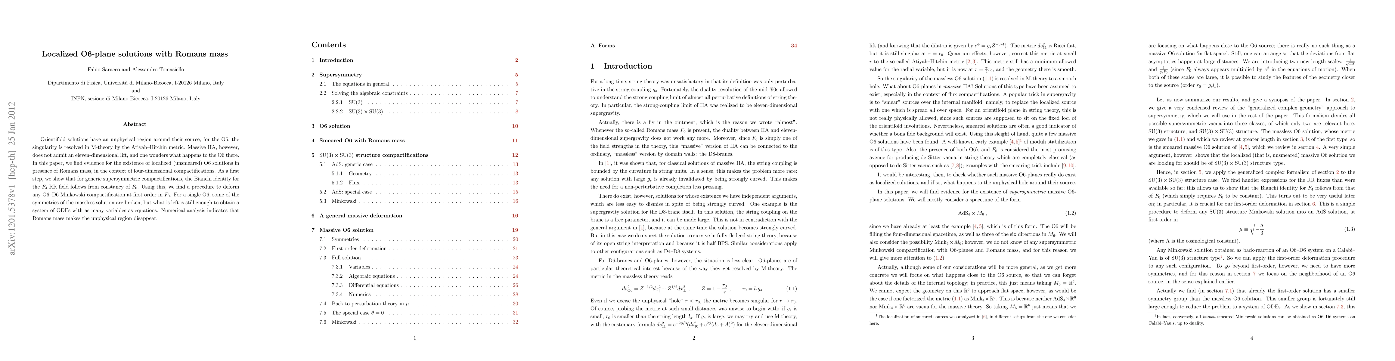 Orientifold solutions have an unphysical region around their source; for the O6, the singularity is resolved in M-theory by the Atiyah-Hitchin metric. Massive IIA, however, does not admit an eleven-dimensional lift, and one wonders what happens to the O6 there. In this paper, we find evidence for the existence of localized (unsmeared) O6 solutions in presence of Romans mass, in the context of four-dimensional compactifications. As a first step, we show that for generic supersymmetric compactifications, the Bianchi identity for the F_4 RR field follows from constancy of F_0. Using this, we find a procedure to deform any O6-D6 Minkowski compactification at first order in F_0. For a single O6, some of the symmetries of the massless solution are broken, but what is left is still enough to obtain a system of ODEs with as many variables as equations. Numerical analysis indicates that Romans mass makes the unphysical region disappear.
