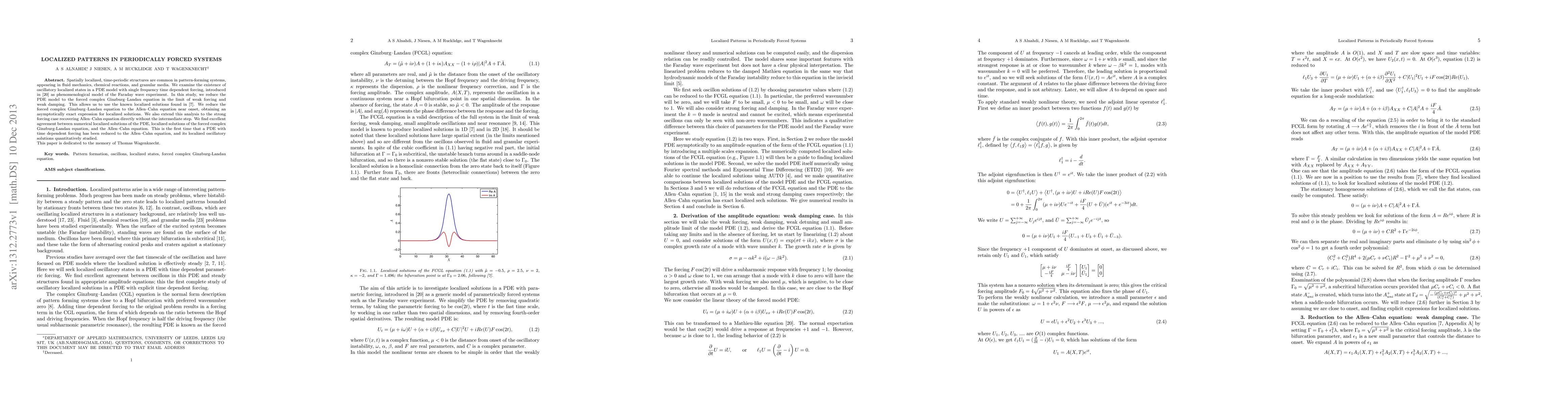 Spatially localized, time-periodic structures are common in pattern-forming systems, appearing in fluid mechanics, chemical reactions, and granular media. We examine the existence of oscillatory localized states in a PDE model with single frequency time dependent forcing, introduced in [20] as phenomenological model of the Faraday wave experiment. In this study, we reduce the PDE model to the forced complex Ginzburg-Landau equation in the limit of weak forcing and weak damping. This allows us to use the known localized solutions found in [7]. We reduce the forced complex Ginzburg-Landau equation to the Allen-Cahn equation near onset, obtaining an asymptotically exact expression for localized solutions. We also extend this analysis to the strong forcing case recovering Allen-Cahn equation directly without the intermediate step. We find excellent agreement between numerical localized solutions of the PDE, localized solutions of the forced complex Ginzburg-Landau equation, and the Allen-Cahn equation. This is the first time that a PDE with time dependent forcing has been reduced to the Allen-Cahn equation, and its localized oscillatory solutions quantitatively studied. This paper is dedicated to the memory of Thomas Wagenknecht.