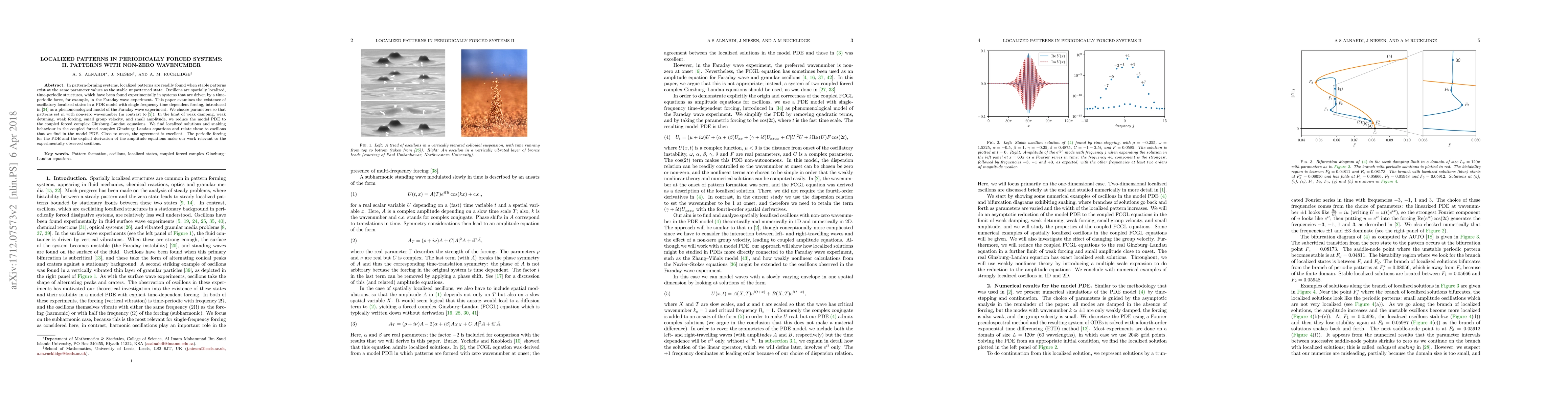 This paper investigates the existence of oscillatory localized states (oscillons) in a periodically forced partial differential equation (PDE) model, focusing on patterns with non-zero wavenumber. It finds localized solutions and snaking behavior in the coupled forced complex Ginzburg-Landau equations derived from the PDE, closely matching the experimentally observed oscillons in systems like the Faraday wave experiment.