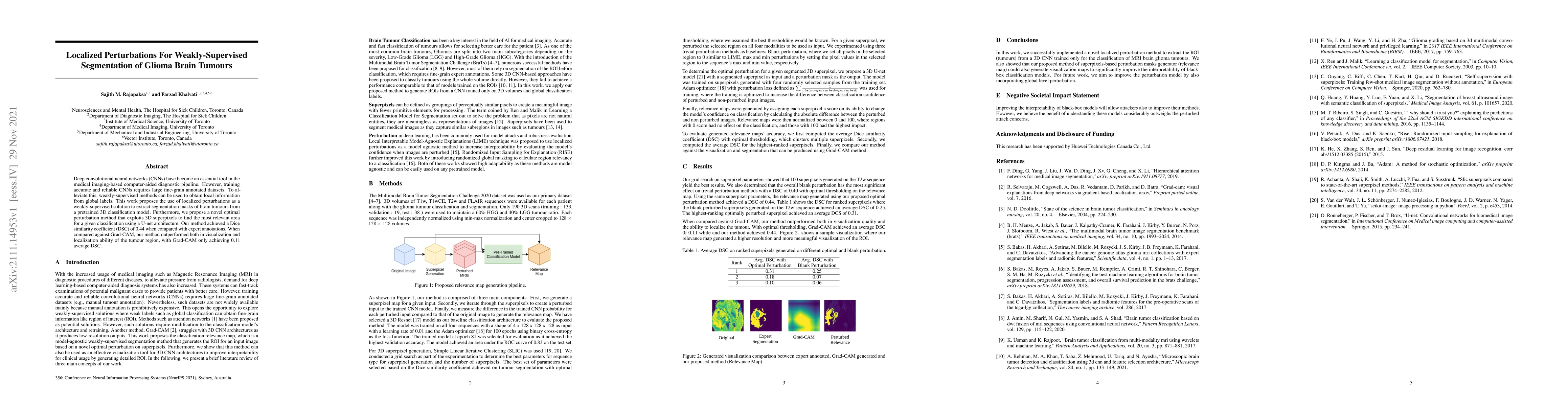 This paper proposes a weakly-supervised method using localized perturbations to segment brain gliomas from medical imaging, leveraging 3D superpixels and a U-net architecture. The method achieved a Dice similarity coefficient of 0.44, outperforming Grad-CAM in both visualization and localization accuracy.