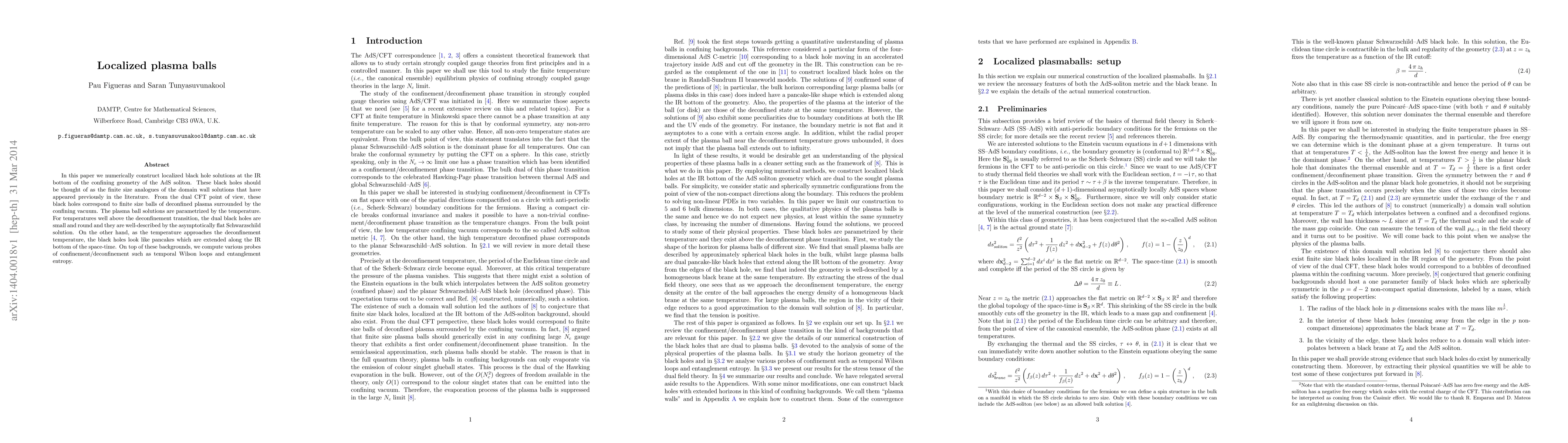 In this paper we numerically construct localised black hole solutions at the IR bottom of the confining geometry of the AdS soliton. These black holes should be thought as the finite size analogues of the domain wall solutions that have appeared previously in the literature. From the dual CFT point of view, these black holes correspond to finite size balls of deconfined plasma surrounded by the confining vacuum. The plasma ball solutions are parametrised by the temperature. For temperatures well above the deconfinement transition, the dual black holes are small and round and they are well-described by the asymptotically flat Schwarzschild solution. On the other hand, as the temperature approaches the deconfinement temperature, the black holes look like pancakes which are extended along the IR bottom of the space-time. On top of these backgrounds, we compute various probes of confinement/deconfinement such as temporal Wilson loops and entanglement entropy.