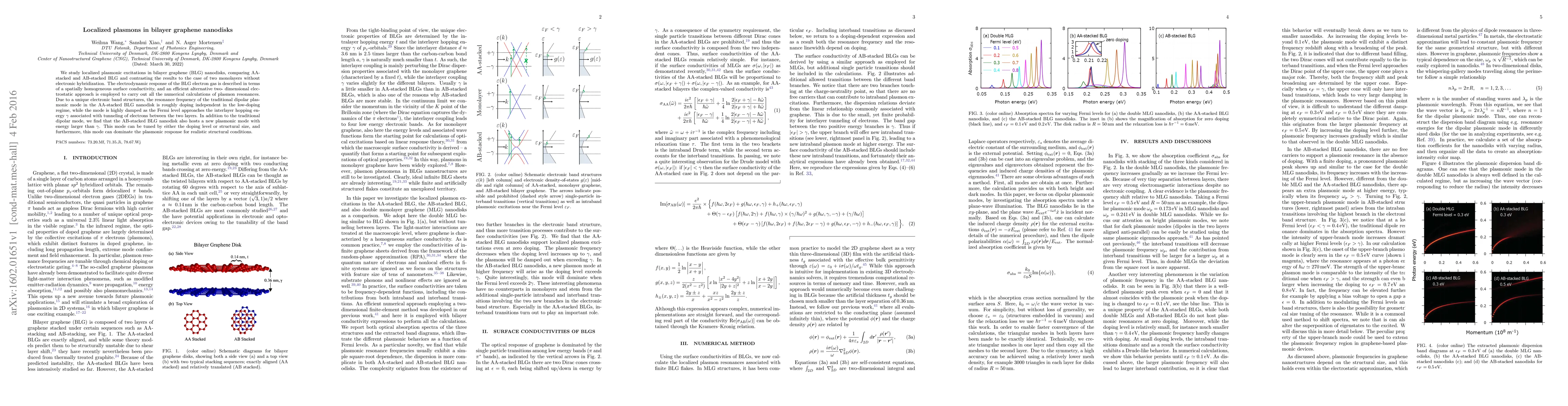 This study investigates localized plasmonic excitations in bilayer graphene nanodisks, revealing that AA-stacked configurations exhibit a doping-independent resonance frequency while AB-stacked configurations host a tunable plasmonic mode influenced by doping and size.