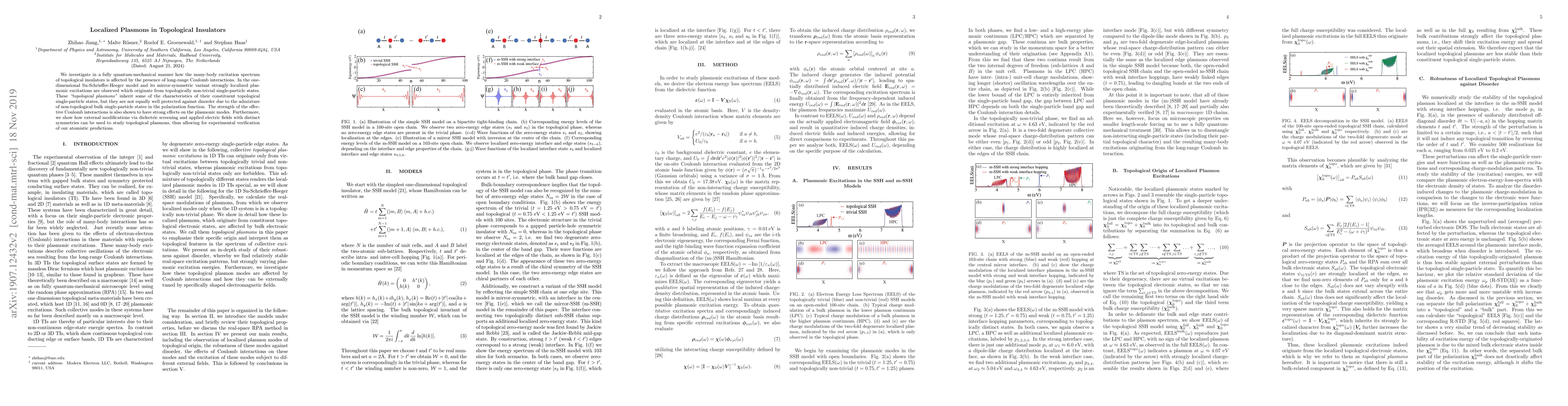 We investigate in a fully quantum-mechanical manner how the many-body excitation spectrum of topological insulators is affected by the presence of long-range Coulomb interactions. In the one-dimensional Su-Schrieffer-Heeger model and its mirror-symmetric variant strongly localized plasmonic excitations are observed which originate from topologically non-trivial single-particle states. These \textit{"topological plasmons"} inherit some of the characteristics of their constituent topological single-particle states, but they are not equally well protected against disorder due to the admixture of non-topological bulk single-particle states in the polarization function. The strength of the effective Coulomb interactions is also shown to have strong effects on the plasmonic modes. Furthermore, we show how external modifications via dielectric screening and applied electric fields with distinct symmetries can be used to study topological plasmons, thus allowing for experimental verification of our atomistic predictions.