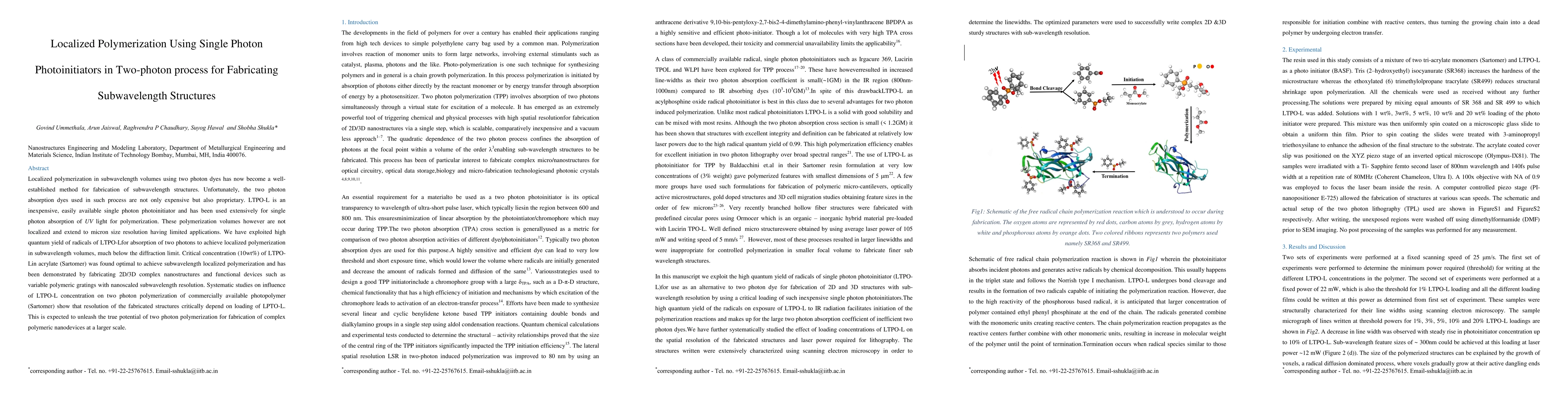 Localized polymerization in subwavelength volumes using two photon dyes has now become a well-established method for fabrication of subwavelength structures. Unfortunately, the two photon absorption dyes used in such process are not only expensive but also proprietary. LTPO-L is an inexpensive, easily available single photon photoinitiator and has been used extensively for single photon absorption of UV light for polymerization. These polymerization volumes however are not localized and extend to micron size resolution having limited applications. We have exploited high quantum yield of radicals of LTPO-Lfor absorption of two photons to achieve localized polymerization in subwavelength volumes, much below the diffraction limit. Critical concentration (10wt%) of LTPO-Lin acrylate (Sartomer) was found optimal to achieve subwavelength localized polymerization and has been demonstrated by fabricating 2D/3D complex nanostructures and functional devices such as variable polymeric gratings with nanoscaled subwavelength resolution. Systematic studies on influence of LTPO-L concentration on two photon polymerization of commercially available photopolymer (Sartomer) show that resolution of the fabricated structures critically depend on loading of LPTO-L. This is expected to unleash the true potential of two photon polymerization for fabrication of complex polymeric nanodevices at a larger scale.
