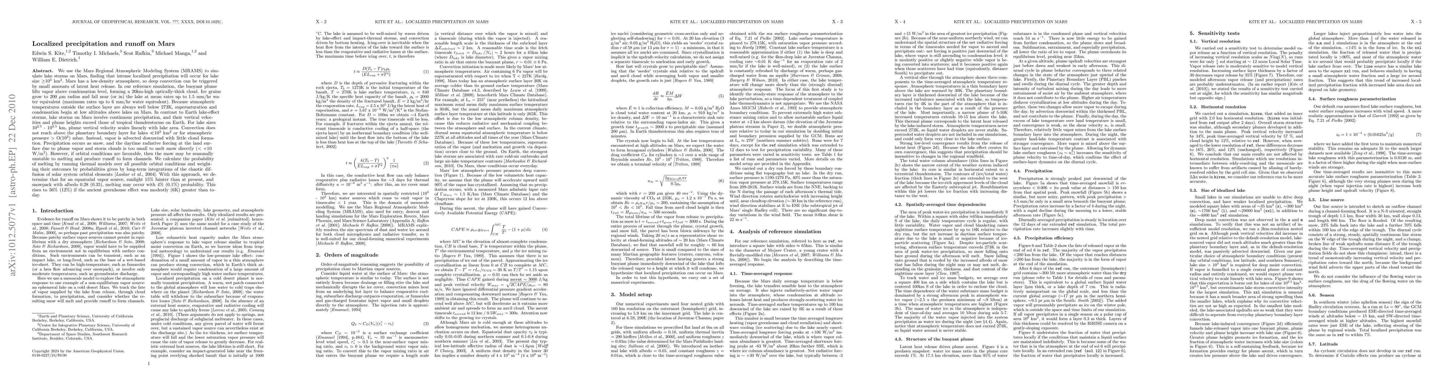 We use the Mars Regional Atmospheric Modeling System (MRAMS) to simulate lake storms on Mars, finding that intense localized precipitation will occur for lake size >=10^3 km^2. Mars has a low-density atmosphere, so deep convection can be triggered by small amounts of latent heat release. In our reference simulation, the buoyant plume lifts vapor above condensation level, forming a 20km-high optically-thick cloud. Ice grains grow to 200 microns radius and fall near (or in) the lake at mean rates up to 1.5 mm/hr water equivalent (maximum rates up to 6 mm/hr water equivalent). Because atmospheric temperatures outside the surface layer are always well below 273K, supersaturation and condensation begin at low altitudes above lakes on Mars. In contrast to Earth lake-effect storms, lake storms on Mars involve continuous precipitation, and their vertical velocities and plume heights exceed those of tropical thunderstorms on Earth. Convection does not reach above the planetary boundary layer for lakes <<10^3 km^2 or for atmospheric pressure >O(10^2) mbar. Instead, vapor is advected downwind with little cloud formation. Precipitation occurs as snow, and the daytime radiative forcing at the land surface due to plume vapor and storm clouds is too small to melt snow directly (<+10 W/m^2). However, if orbital conditions are favorable, then the snow may be seasonally unstable to melting and produce runoff to form channels. We calculate the probability of melting by running thermal models over all possible orbital conditions and weighting their outcomes by probabilities given by Laskar et al., 2004. We determine that for an equatorial vapor source, sunlight 15% fainter than at present, and snowpack with albedo 0.28 (0.35), melting may occur with 4%(0.1%) probability. This rises to 56%(12%) if the ancient greenhouse effect was modestly (6K) greater than today.