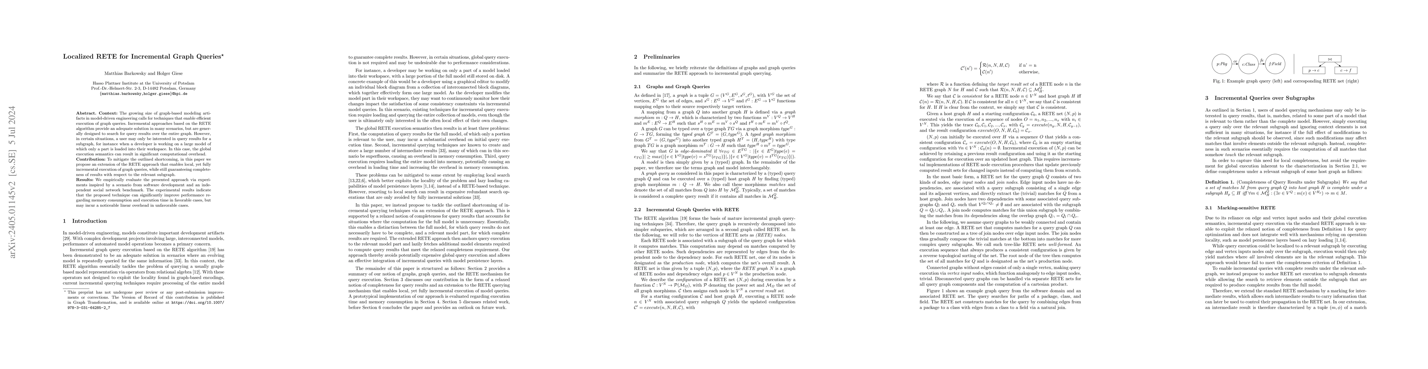 This paper proposes a localized extension of the RETE algorithm for incremental execution of graph queries, focusing on subgraphs rather than the entire graph to reduce computational overhead. Experiments show improved performance in memory consumption and execution time in favorable scenarios, with a linear overhead in less favorable cases.