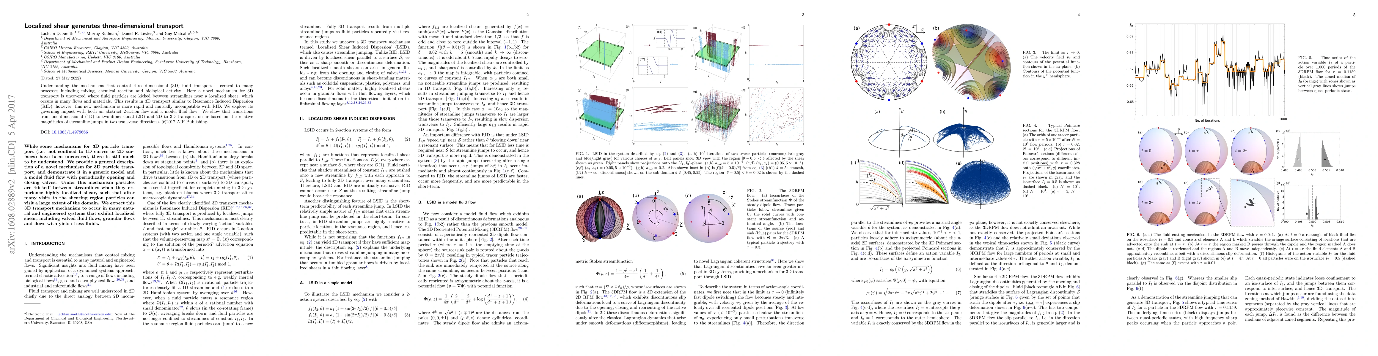 Understanding the mechanisms that control three-dimensional (3D) fluid transport is central to many processes including mixing, chemical reaction and biological activity. Here a novel mechanism for 3D transport is uncovered where fluid particles are kicked between streamlines near a localized shear, which occurs in many flows and materials. This results in 3D transport similar to Resonance Induced Dispersion (RID); however, this new mechanism is more rapid and mutually incompatible with RID. We explore its governing impact with both an abstract 2-action flow and a model fluid flow. We show that transitions from one-dimensional (1D) to two-dimensional (2D) and 2D to 3D transport occur based on the relative magnitudes of streamline jumps in two transverse directions.