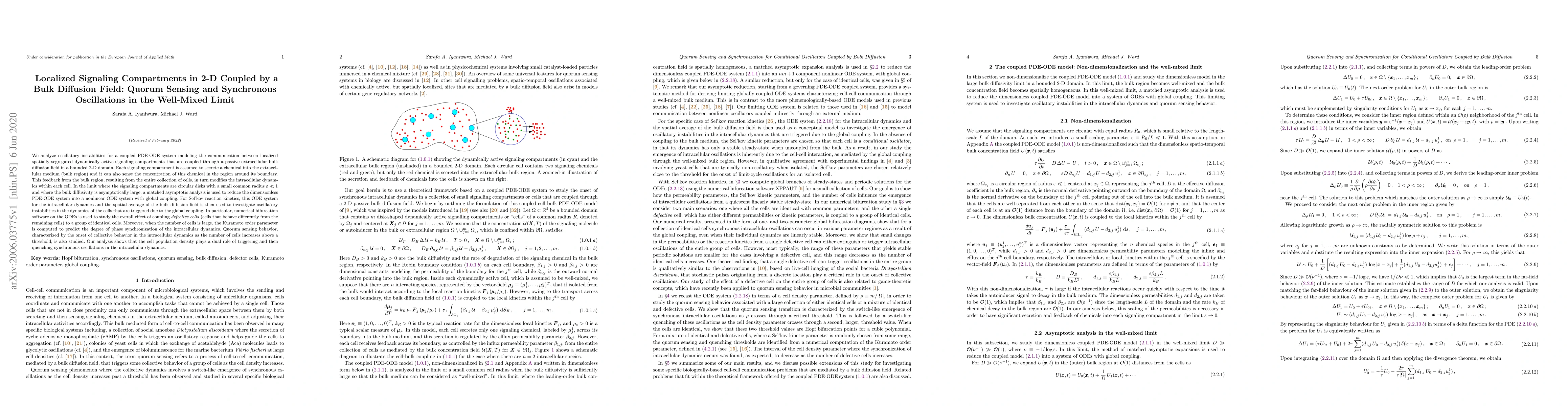 We analyze oscillatory instabilities for a coupled PDE-ODE system modeling the communication between localized spatially segregated dynamically active signaling compartments that are coupled through a passive extracellular bulk diffusion field in a bounded 2-D domain. Each signaling compartment is assumed to secrete a chemical into the extracellular medium (bulk region) and it can also sense the concentration of this chemical in the region around its boundary. This feedback from the bulk region, resulting from the entire collection of cells, in turn modifies the intracellular dynamics within each cell. In the limit where the signaling compartments are circular disks with a small common radius $\epsilon \ll 1$ and where the bulk diffusivity is asymptotically large, a matched asymptotic analysis is used to reduce the dimensionless PDE-ODE system into a nonlinear ODE system with global coupling. For Sel'kov reaction kinetics, this ODE system for the intracellular dynamics and the spatial average of the bulk diffusion field is then used to investigate oscillatory instabilities in the dynamics of the cells that are triggered due to the global coupling. In particular, numerical bifurcation software on the ODEs is used to study the overall effect of coupling defective cells (cells that behave differently from the remaining cells) to a group of identical cells. Moreover, when the number of cells is large, the Kuramoto order parameter is computed to predict the degree of phase synchronization of the intracellular dynamics. Quorum sensing behavior, characterized by the onset of collective behavior in the intracellular dynamics as the number of cells increases above a threshold, is also studied. Our analysis shows that the cell population density plays a dual role of triggering and then quenching synchronous oscillations in the intracellular dynamics.
