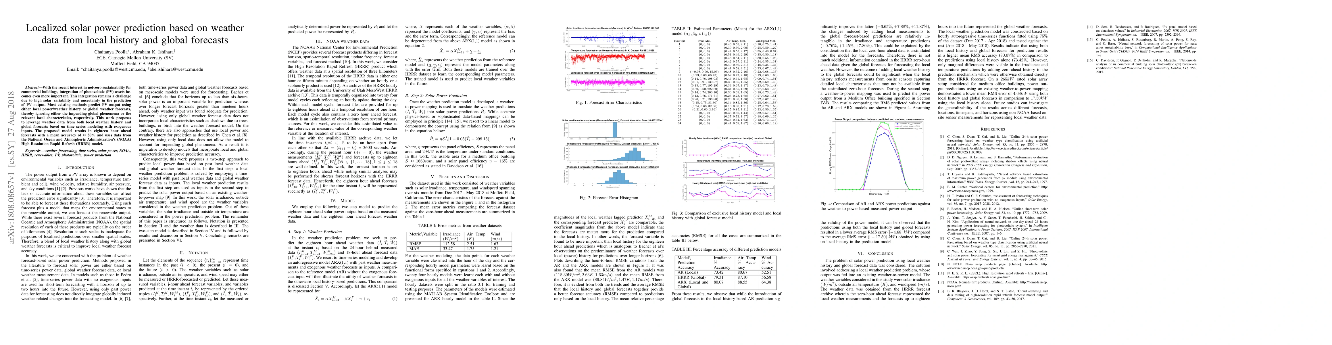 This paper proposes a model for localized solar power prediction using both local weather history and global forecasts, achieving an 80% mean accuracy for 18-hour ahead forecasts. It addresses the challenge of high solar variability and prediction uncertainty by integrating data from NOAA's HRRR model.