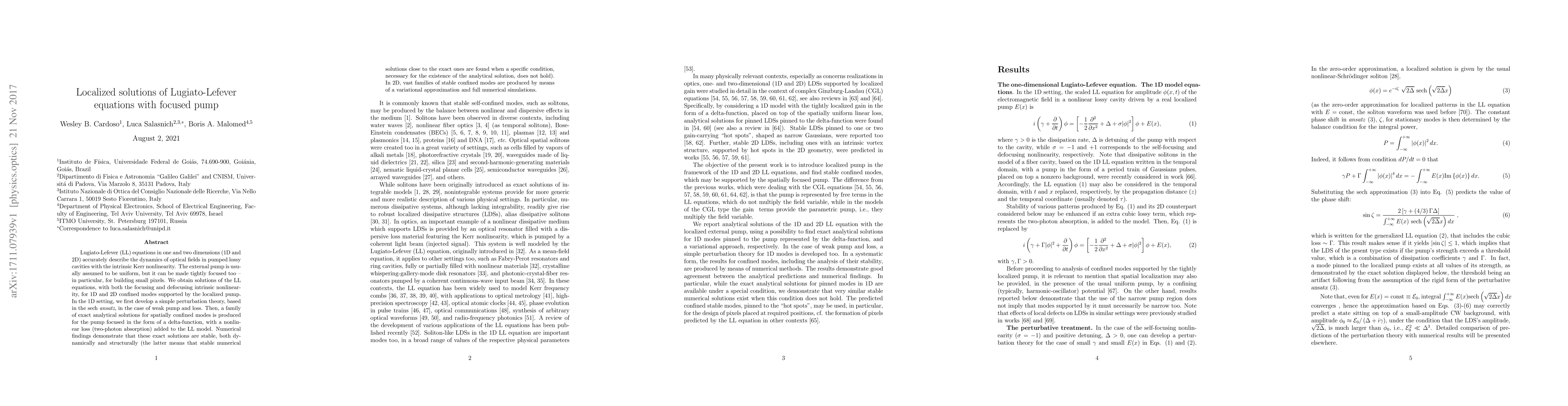 Researchers developed localized solutions to the Lugiato-Lefever equations for optical fields with a tightly focused pump, predicting stable confined modes in 1D and 2D settings.