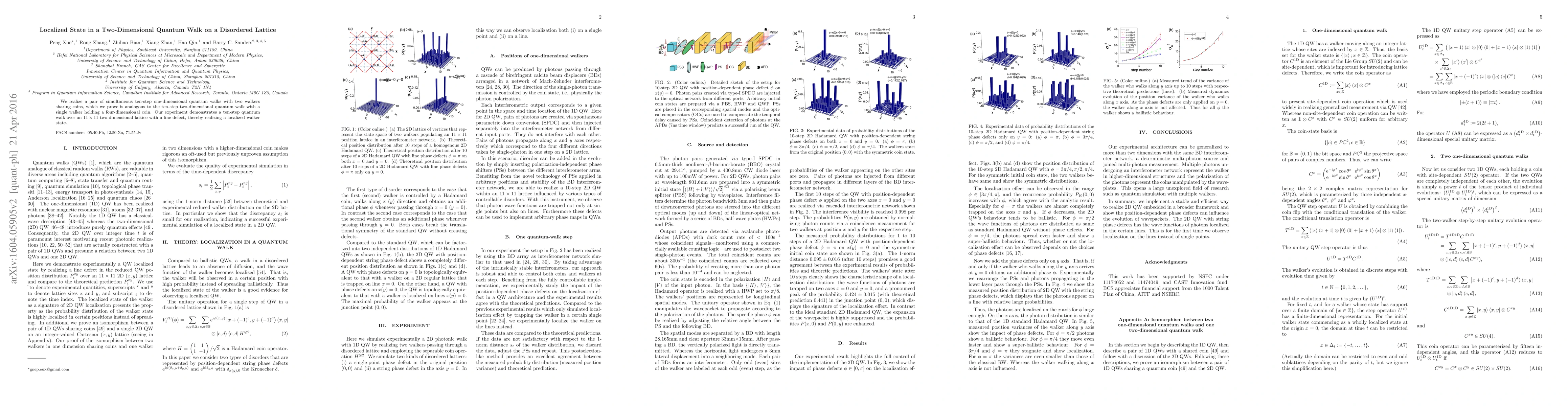 This research demonstrates a ten-step two-dimensional quantum walk on a disordered lattice with a line defect, showing localized state formation. The experiment uses a pair of ten-step one-dimensional quantum walks with shared coins, analogous to a single walker with a four-dimensional coin.