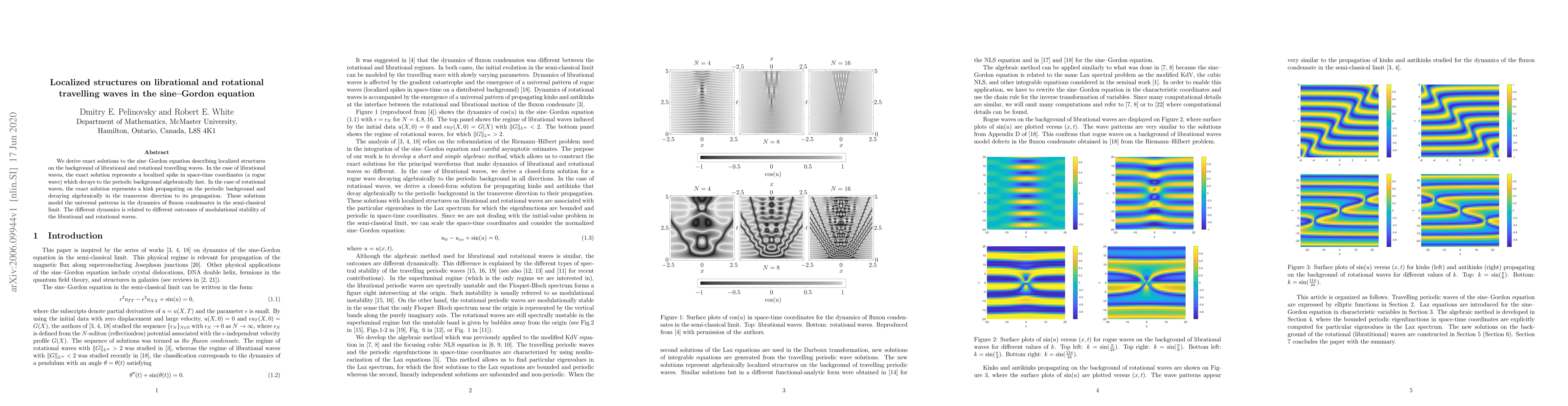 The paper derives exact solutions for localized structures in the sine-Gordon equation on librational and rotational travelling waves, showing a rogue wave decaying rapidly in librational waves and a kink decaying in the transverse direction in rotational waves, reflecting different modulational stability outcomes.
