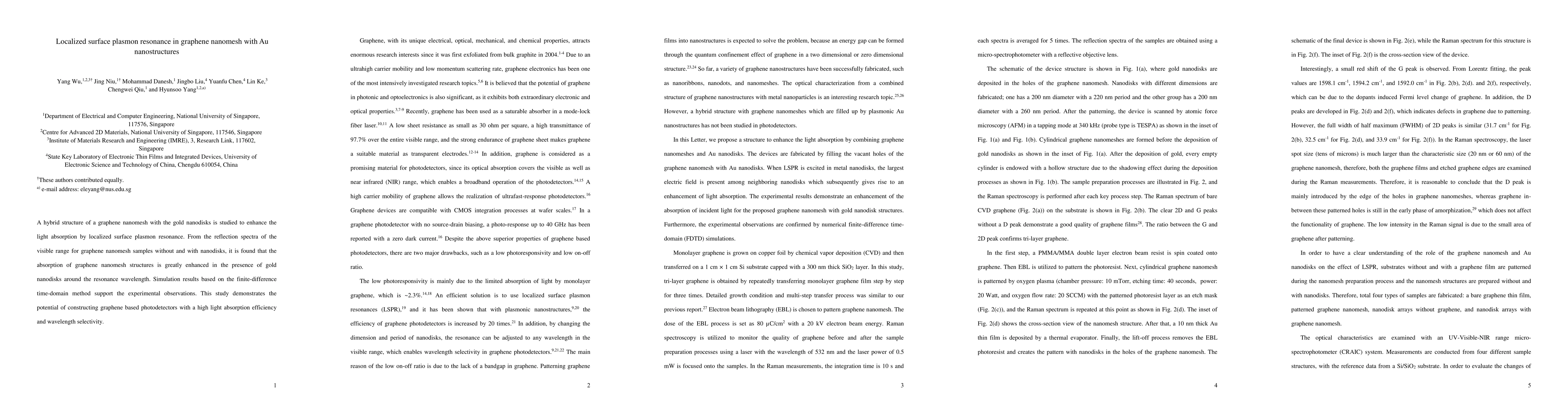 This study investigates a graphene nanomesh hybridized with gold nanodisks to amplify light absorption via localized surface plasmon resonance. Experimental and simulation results reveal significantly enhanced absorption in the presence of gold nanodisks, highlighting the potential for graphene-based photodetectors with high efficiency and selectivity.