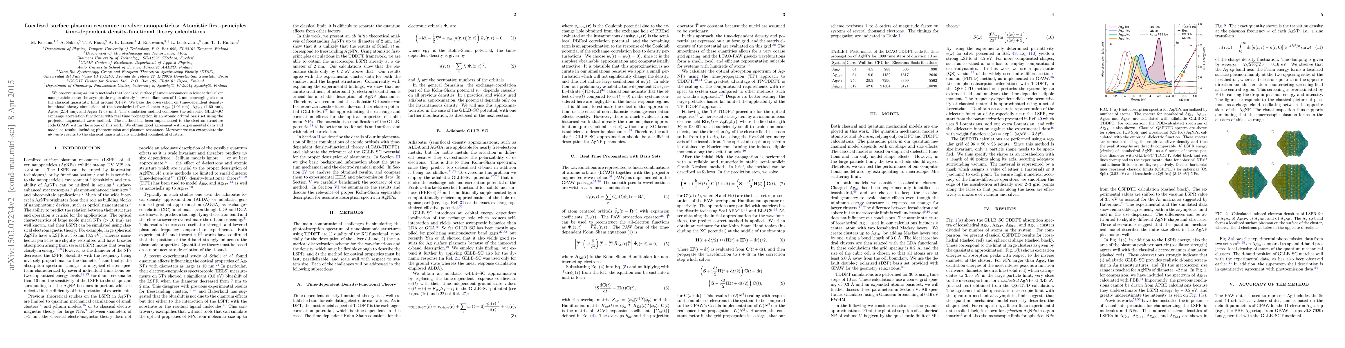 We observe using ab initio methods that localized surface plasmon resonances in icosahedral silver nanoparticles enter the asymptotic region already between diameters of 1 and 2 nm, converging close to the classical quasistatic limit around 3.4 eV. We base the observation on time-dependent density-functional theory simulations of the icosahedral silver clusters Ag$_{55}$ (1.06 nm), Ag$_{147}$ (1.60 nm), Ag$_{309}$ (2.14 nm), and Ag$_{561}$ (2.68 nm). The simulation method combines the adiabatic GLLB-SC exchange-correlation functional with real time propagation in an atomic orbital basis set using the projector-augmented wave method. The method has been implemented for the electron structure code GPAW within the scope of this work. We obtain good agreement with experimental data and modeled results, including photoemission and plasmon resonance. Moreover, we can extrapolate the ab initio results to the classical quasistatically modeled icosahedral clusters.
