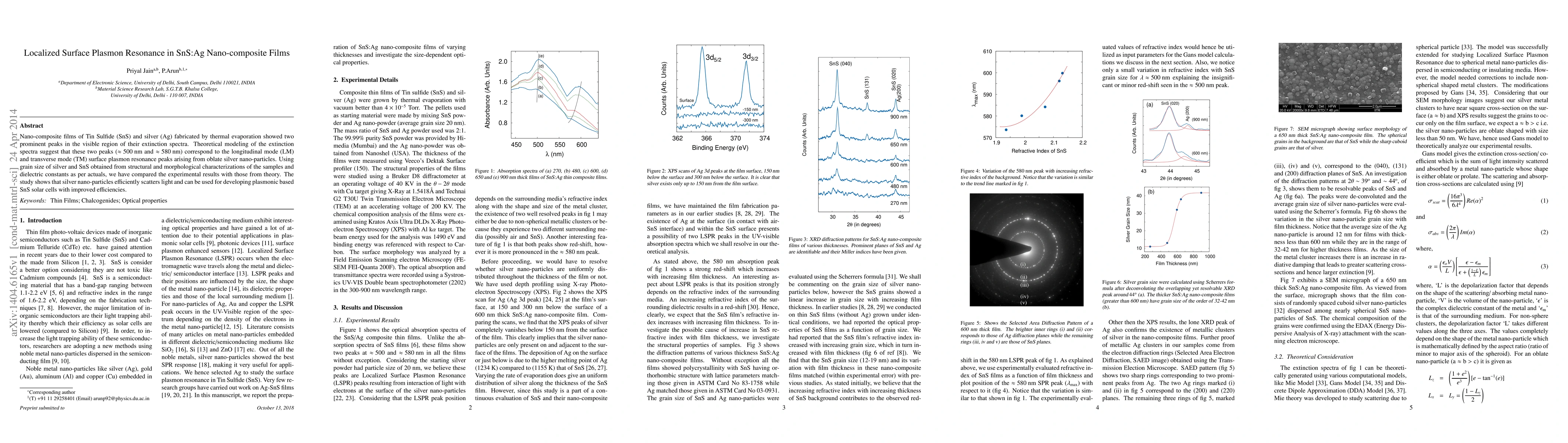 This paper investigates SnS:Ag nano-composite films, revealing two prominent extinction peaks corresponding to surface plasmon resonance from silver nanoparticles. Theoretical modeling and experimental results suggest potential for enhancing SnS solar cell efficiencies through plasmonic effects.